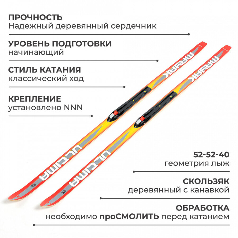 | Дополнительная информация | Скользящую поверхность деревянных лыж необходимо смолить или обрабатывать специальным составом для предотвращения намокания древесины, не менее 1 раза в сезон |