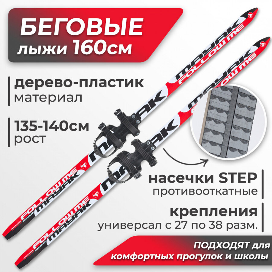 Лыжи беговые подростковые Маяк 160 см дерево-пластик (с насечками) с универсальными креплениями, красно-бело-черные интересное: