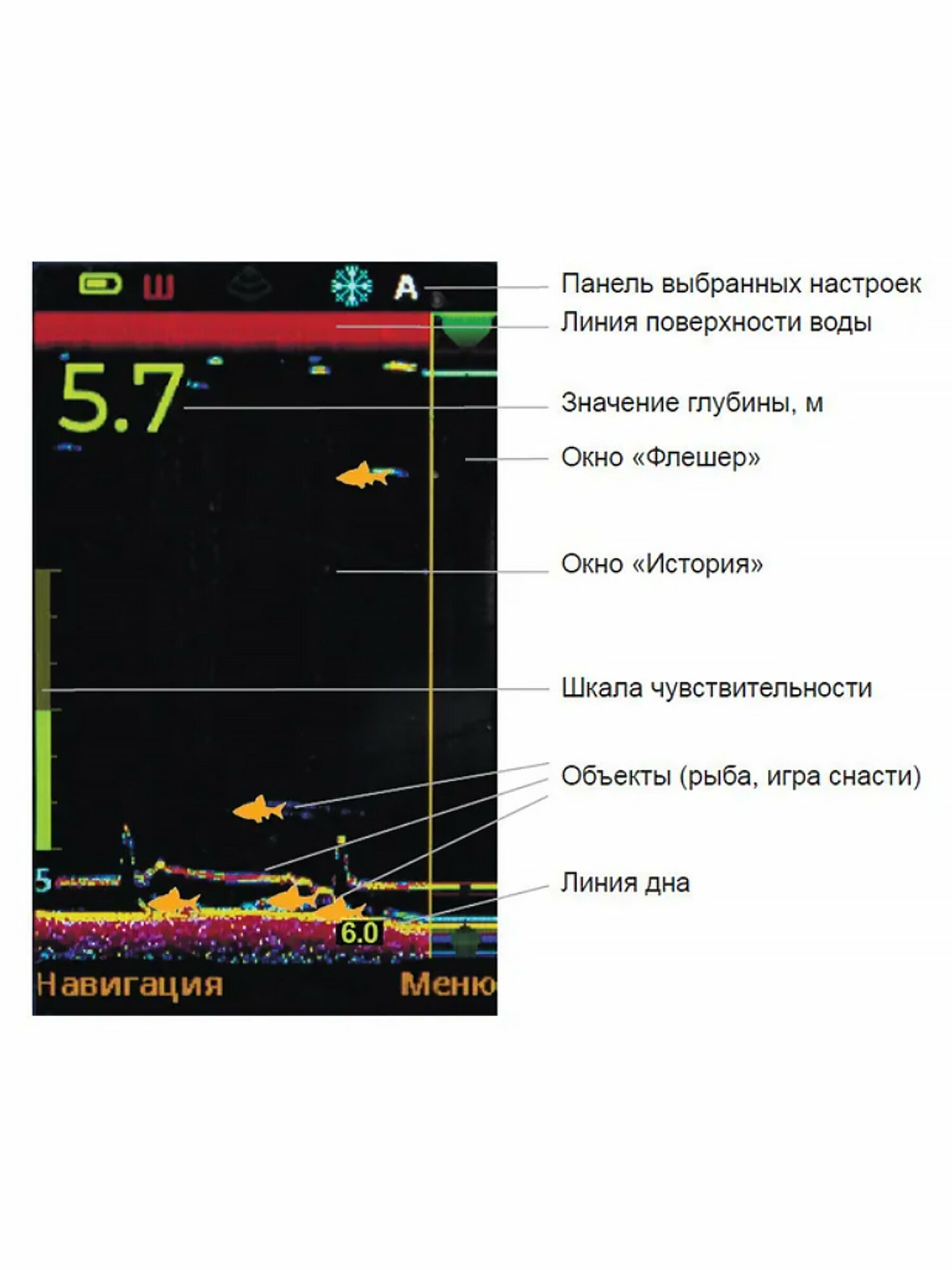 | Функции и интерфейсы | датчик температуры, отображение структуры дна |