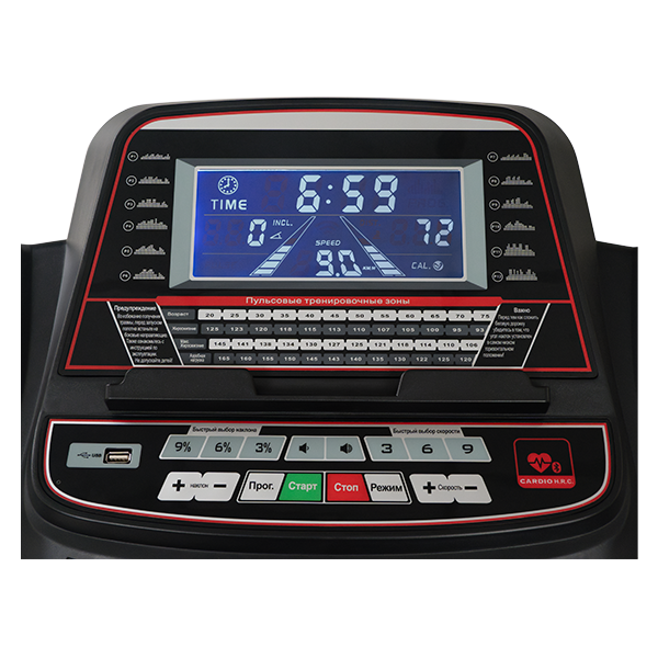 | Показания дисплея | время тренировки в целевой зоне / пройденное расстояние / пульс / расход калорий / текущая скорость / угол наклона |
