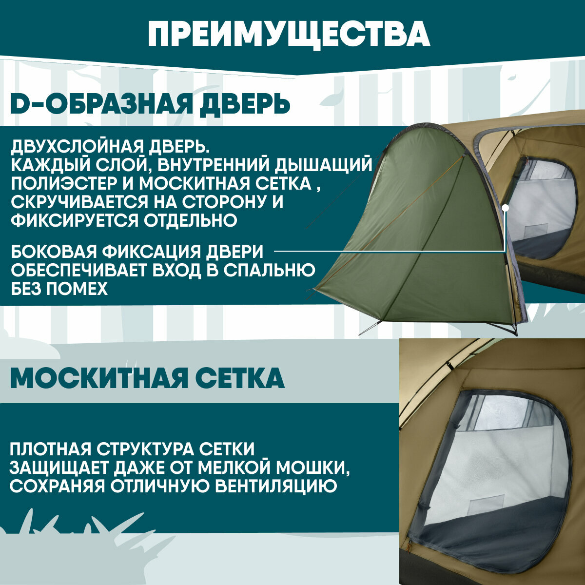 | Особенности | 1 комната / вентиляционные отверстия / внутренние карманы / внутренняя палатка / навес / окна / проклеенные швы / противомоскитная сетка / тамбур / тент |