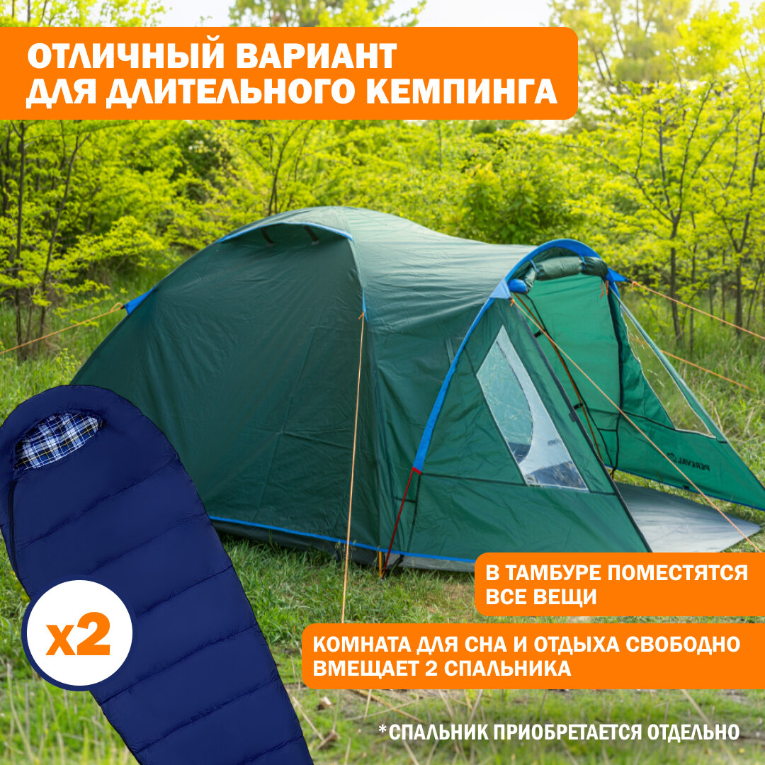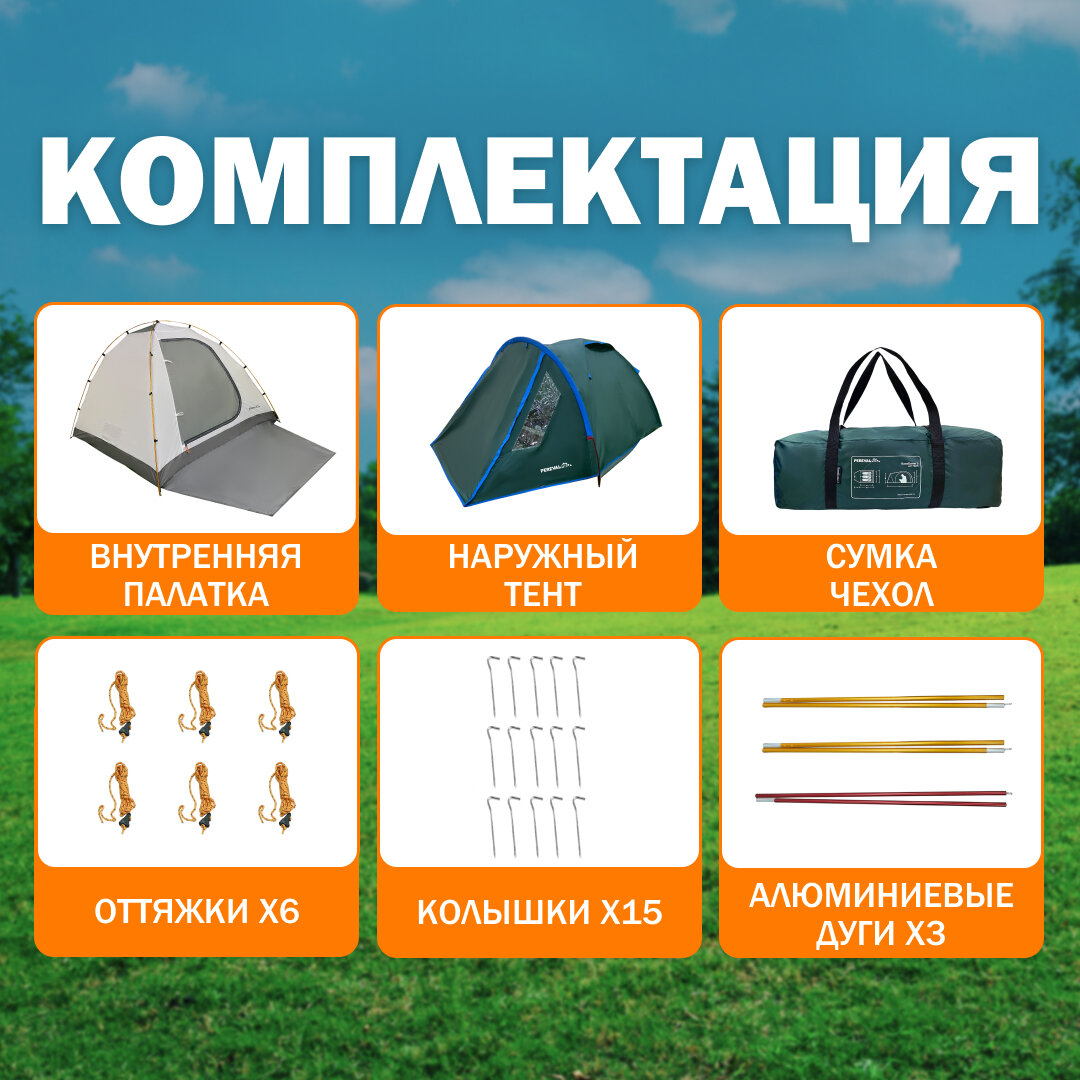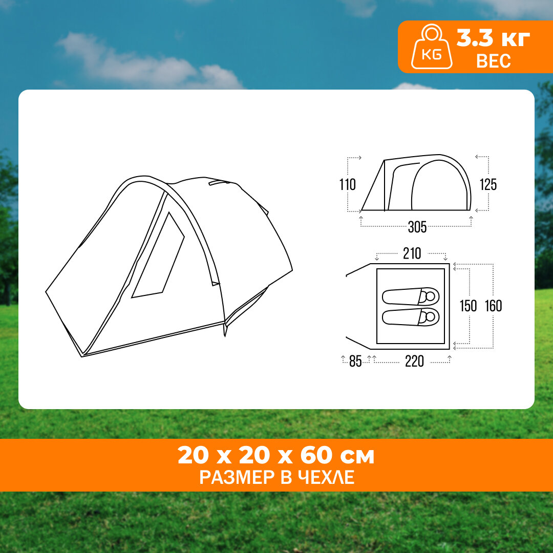 | Дополнительная информация | длина внутренней палатки: 210 см; ширина внутренней палатки: 150 см; высота внутренней палатки: 120 см; количество вентиляционных отверстий: 3; подробная комплектация: Палатка двухслойная - 1 шт |