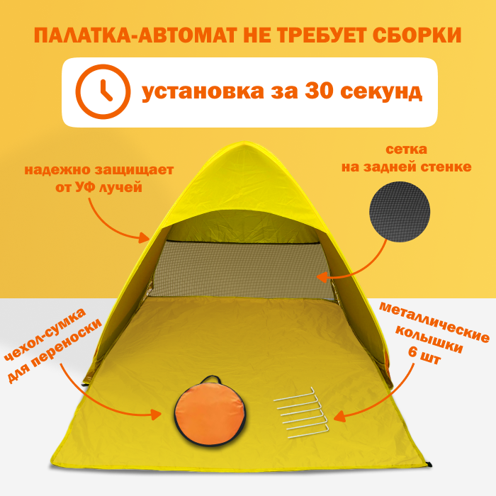 Палатка 2-местная пляжная автоматическая 150х165х110см / тент от солнца (автомат не требует сборки) (Желтый) интересное: