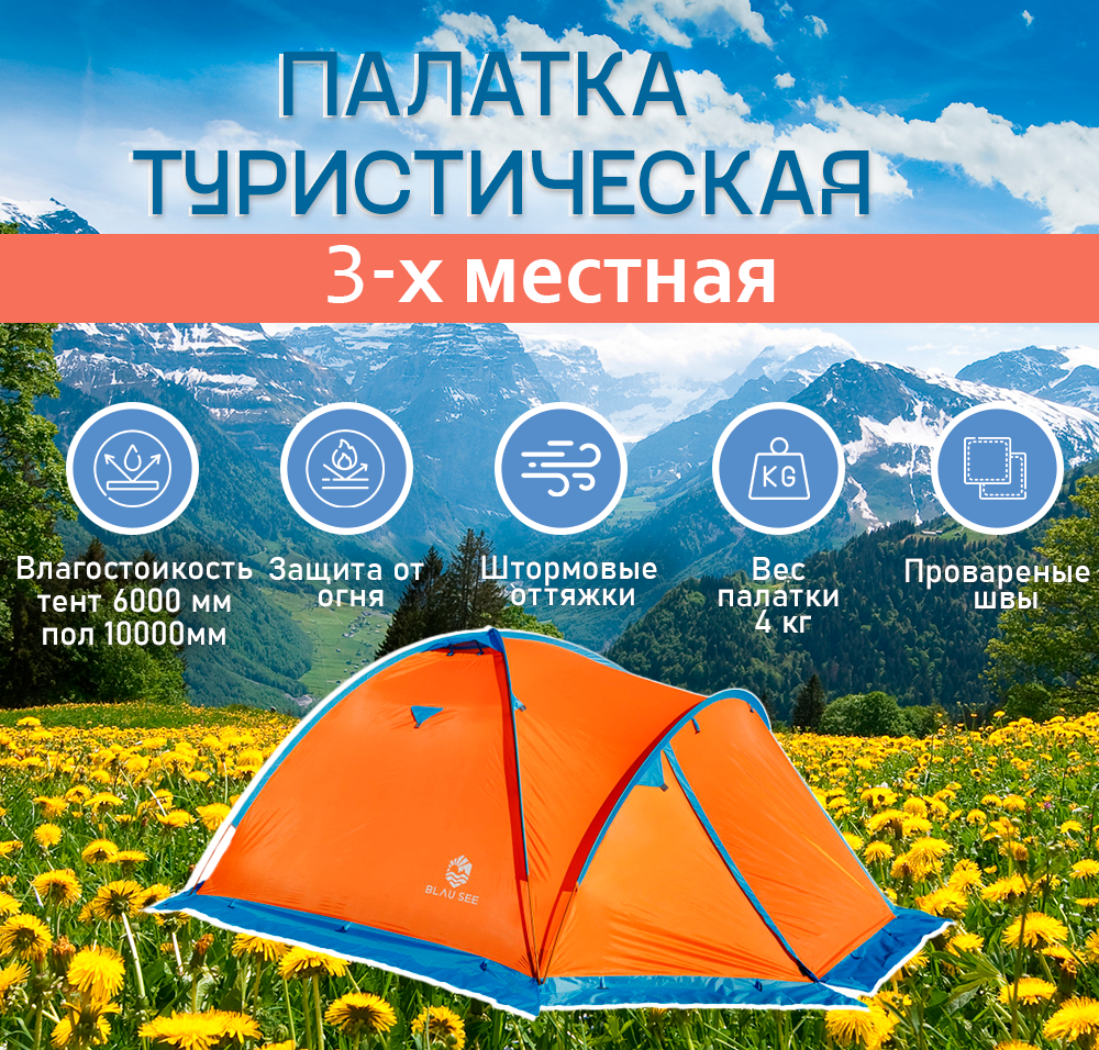 Палатка туристическая кемпинговая 3-х местная Blau see Ай-Петри-3 с москитной сеткой и непромокаемым полом интересное: