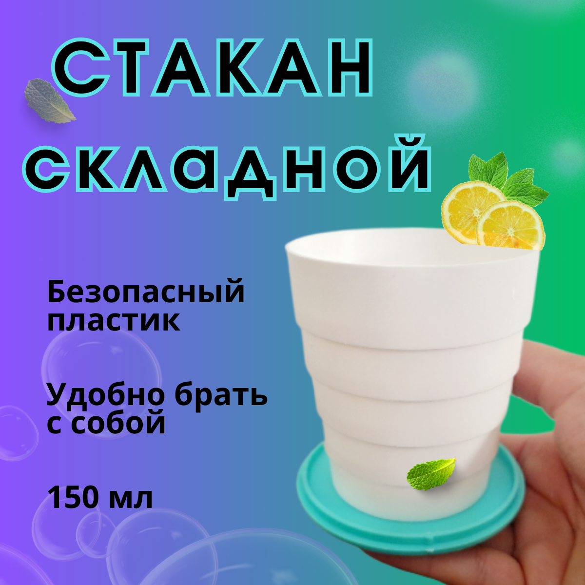 Складной стаканчик, 150мл, стакан пластиковый многоразовый, бирюзовый. интересное: