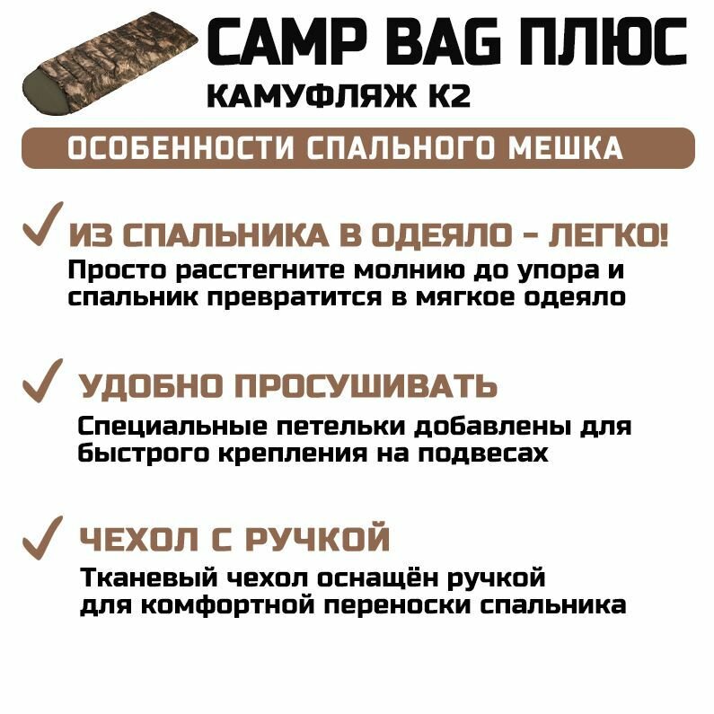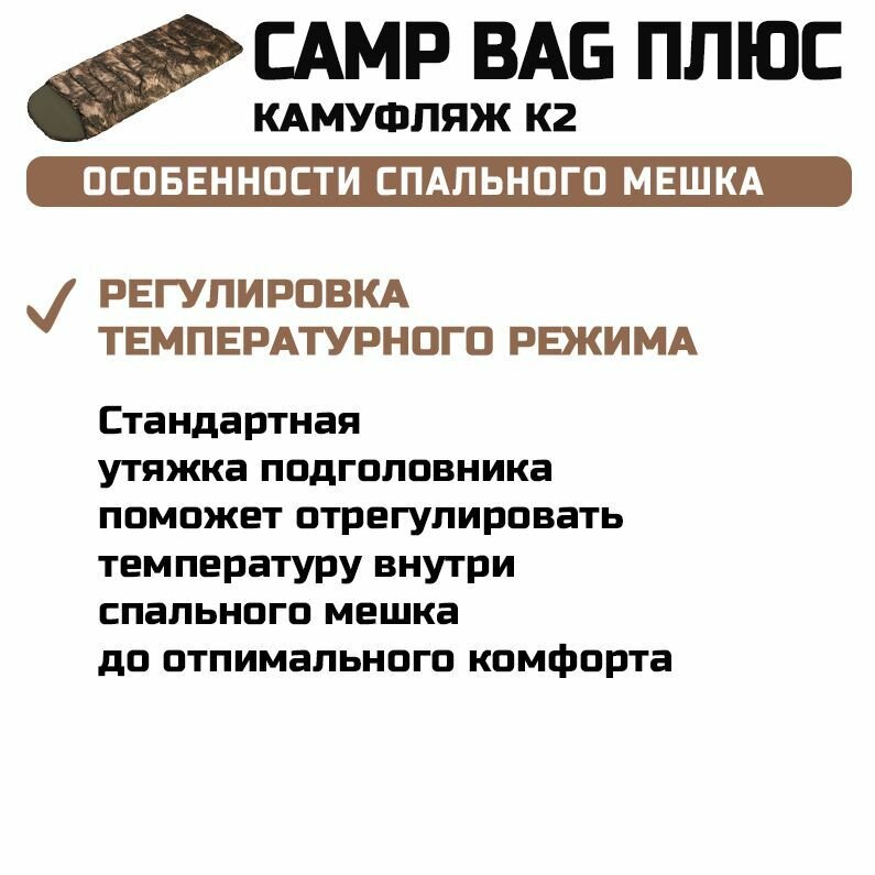 Спальный мешок с подголовником Prival Camp bag плюс, до -5C, 220х90см, камуфляж К2, молния слева интересное: