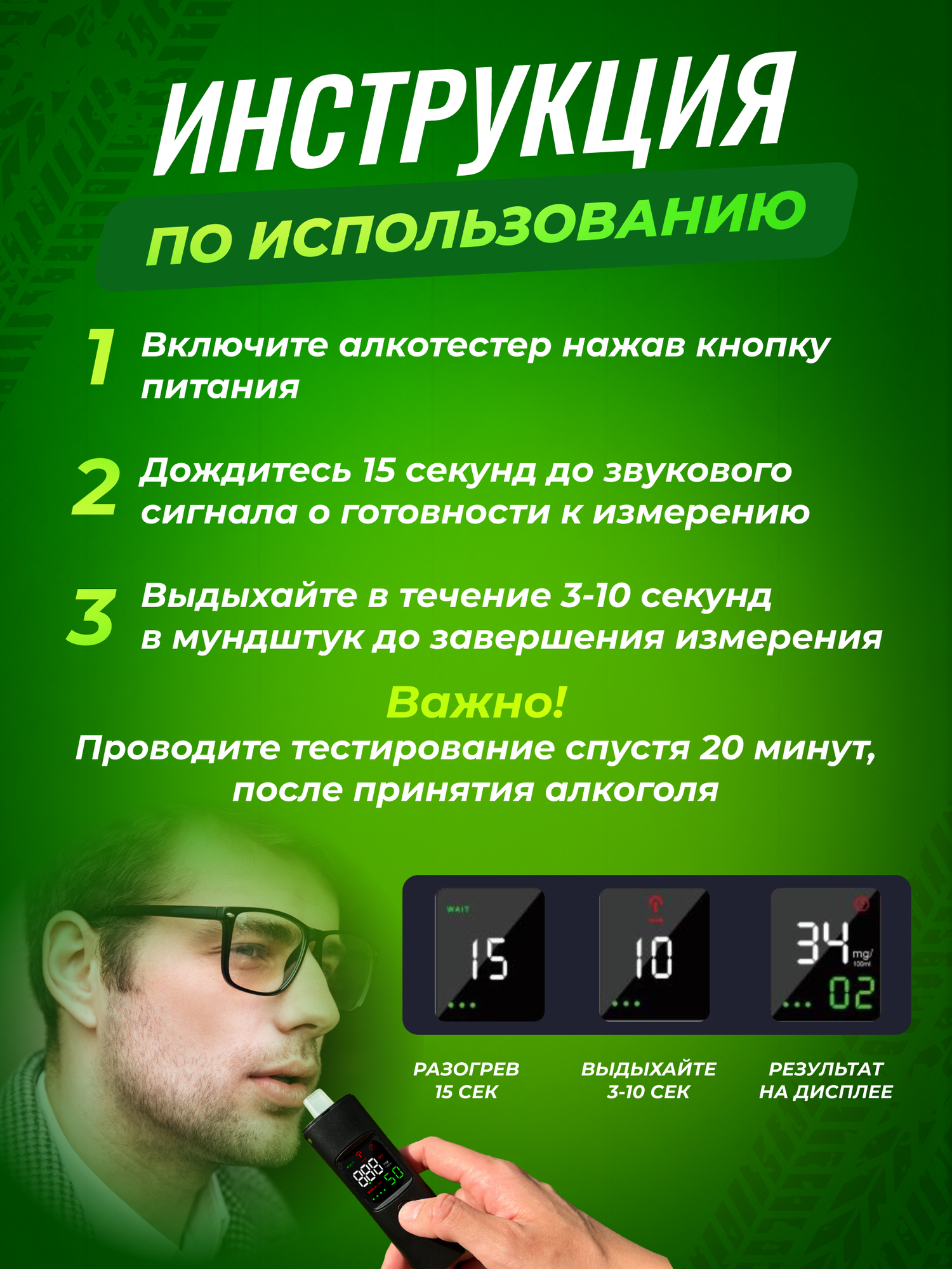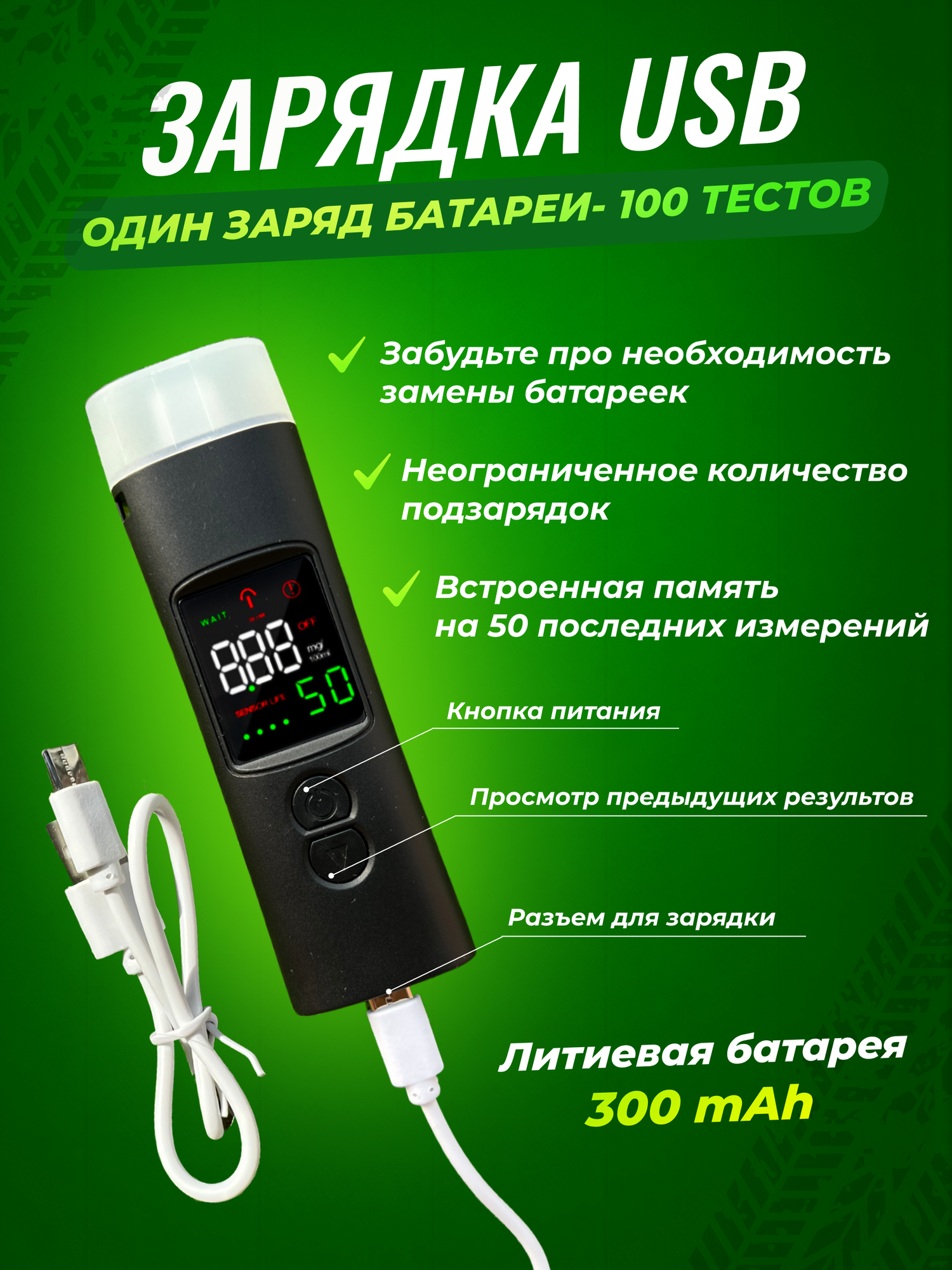 | Подробная комплектация | Алкотестер, 3 мундштука, чехол, USB провод, инструкция |
