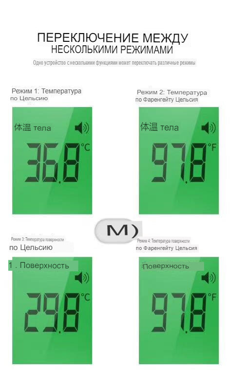 | Способ измерения | бесконтактный / височный / лобный / нагрудный / оральный / подмышечный / ректальный / ушной |