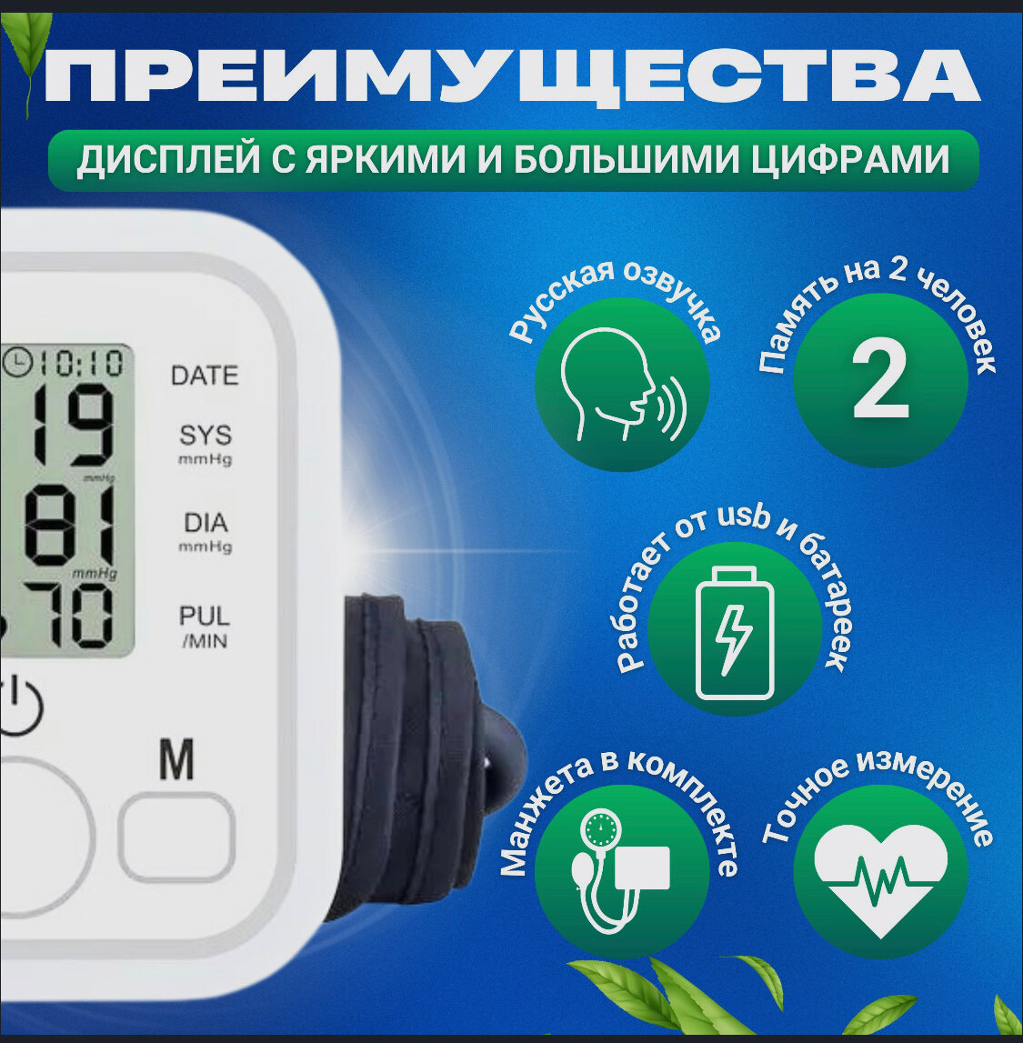 Тонометр автоматический с русской озвучкой для измерения давления на плечо, манжета 22-32 см / батарейки в комплекте + USB провод интересное: