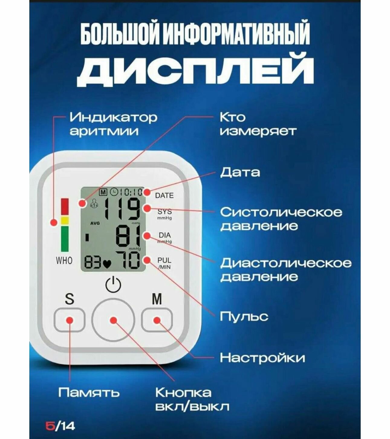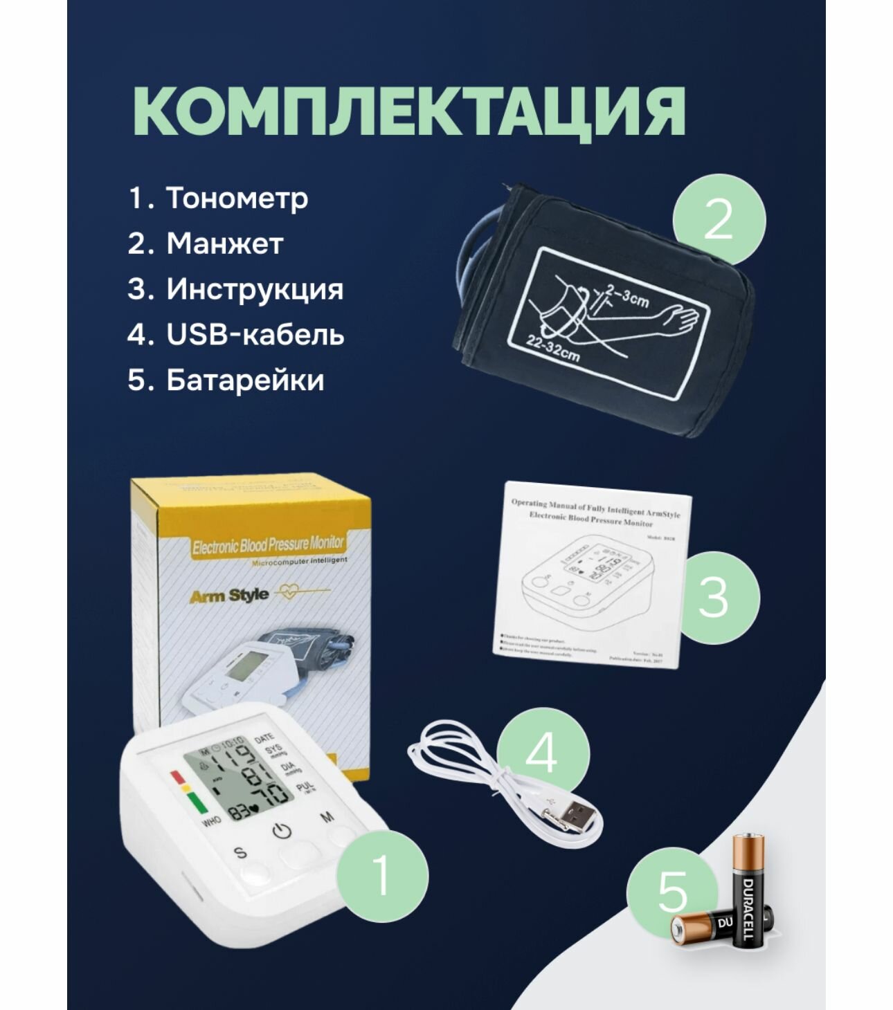| Комплектация | Тонометр, инструкция на русском языке, батарейки |