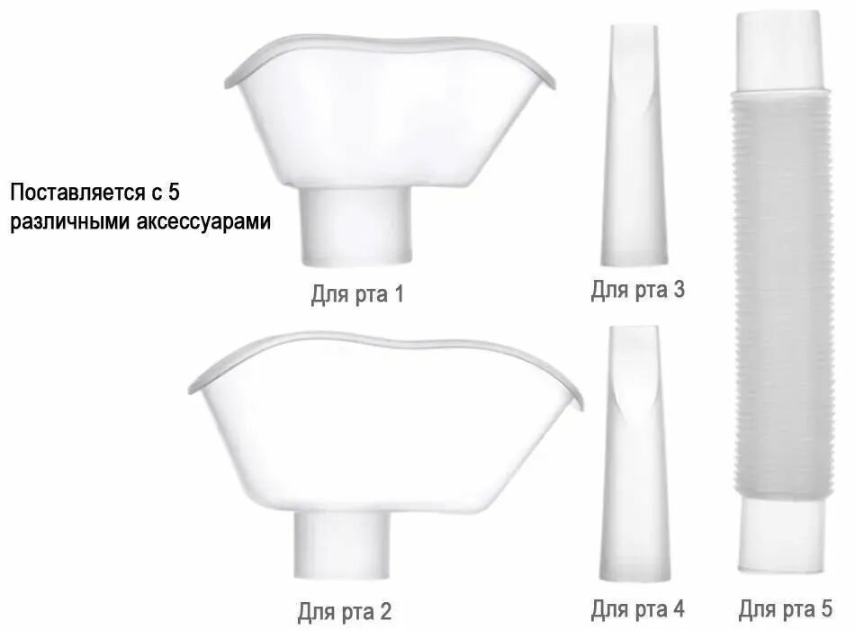 | Подробная комплектация | Блок питания, детская и взрослая маски для него, 2 мундштука, гофрированная удлинительная трубка, 5 стаканчиков для лекарств на 10мл и резиновая прокладка. |