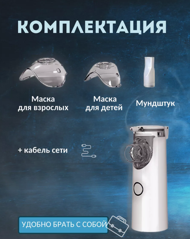 | Подробная комплектация | Ингалятор, насадка для взрослого, насадка детская, мундштук, заглушка, провод USB Type-C |