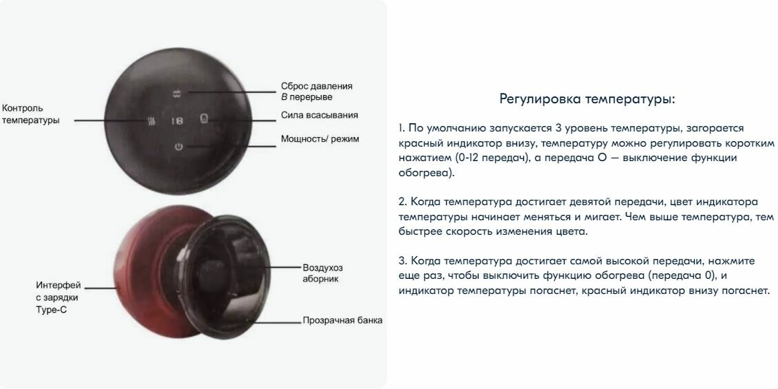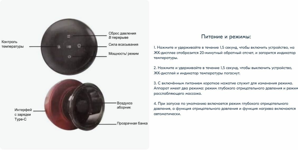 | Особенности | автоматическое отключение / беспроводной / дисплей / индикация заряда / подогрев / подсветка / регулировка интенсивности массажа / регулировка скорости |
