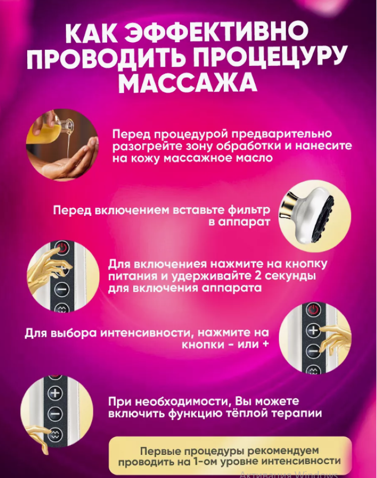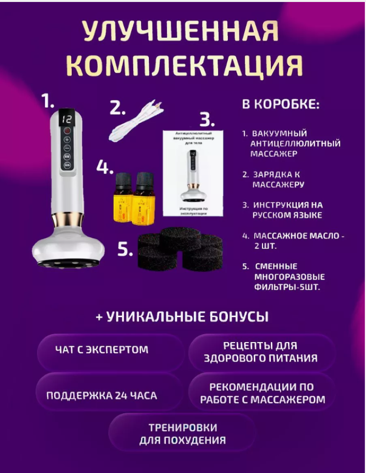| Вид массажа | вакуумный / вибрационный / лимфодренажный |