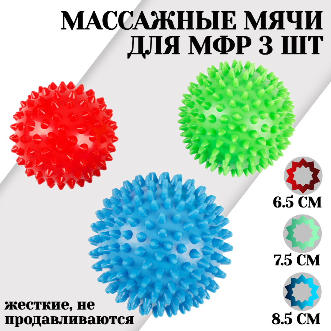 Комплект из 3 жестких массажных мячей с игольчатой поверхностью STRONG BODY: 6.5 см, 7.5 см, 8.5 см (мяч для МФР, фитнеса, валик, ролик) интересное: