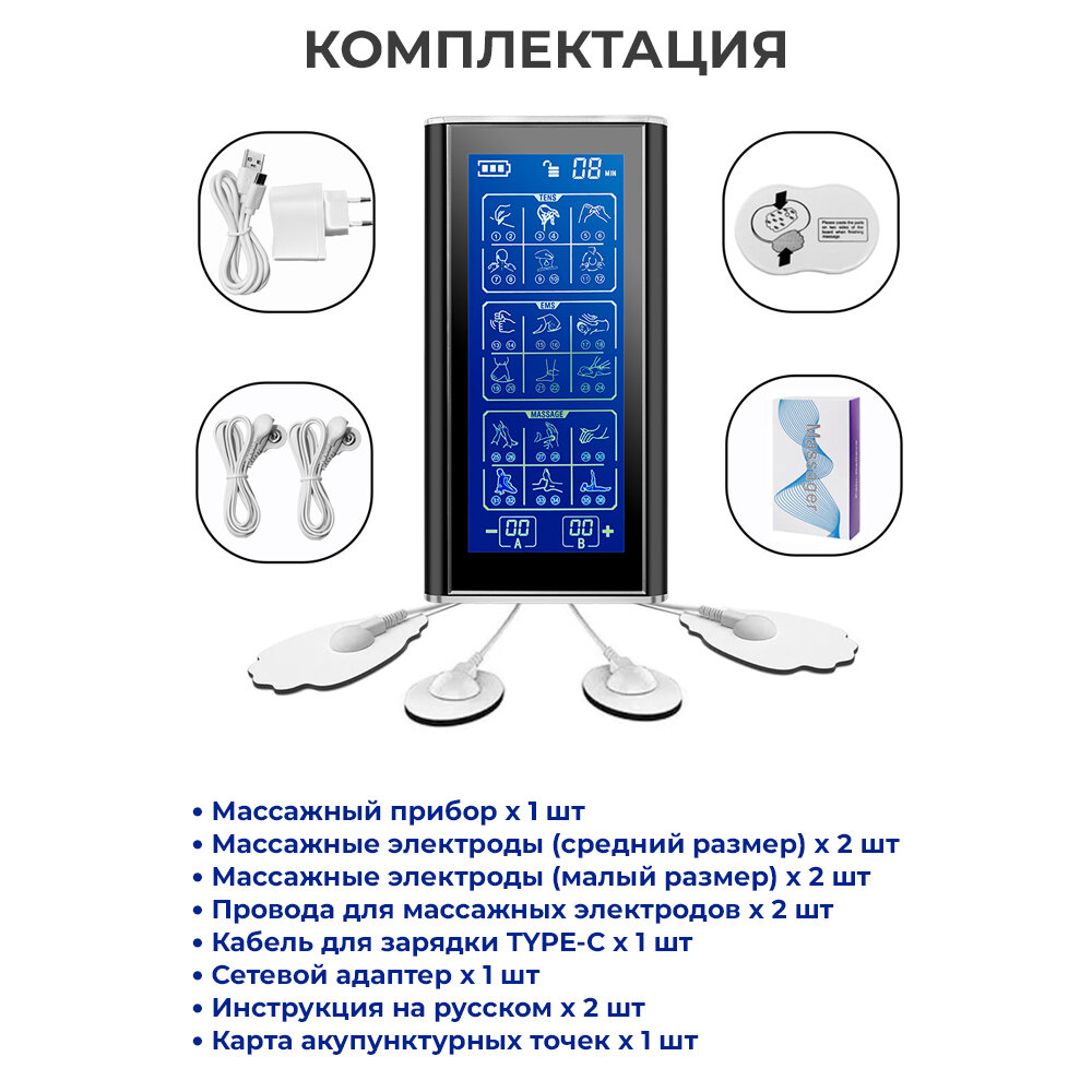 | Комплектация | Массажный прибор, провода для массажных электродов - 2 шт, массажные электроды (средний и малый размер) - 4 шт, сетевой адаптер и кабель для зарядки Micro USB, инструкция - 2 шт. |