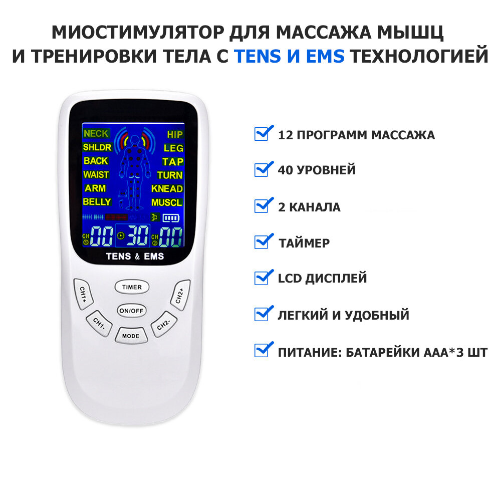Массажер миостимулятор EMS TENS для тела EMS-120 2 канала, 12 режимов массажа, беспроводнойм интересное: