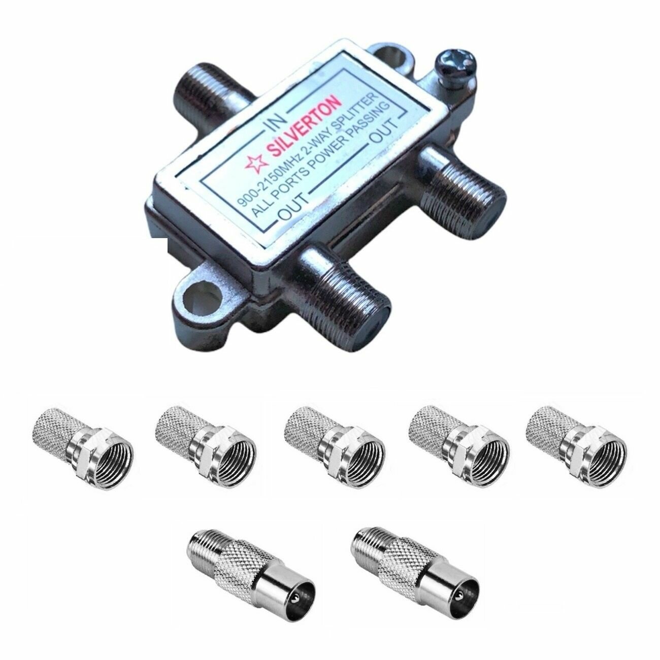 Купить Делитель на 2 выхода для эфирного и спутникового ТВ, 5-2150МГц + ТВ штекер (2 штуки) + F разъемы (5 штук) комплект.