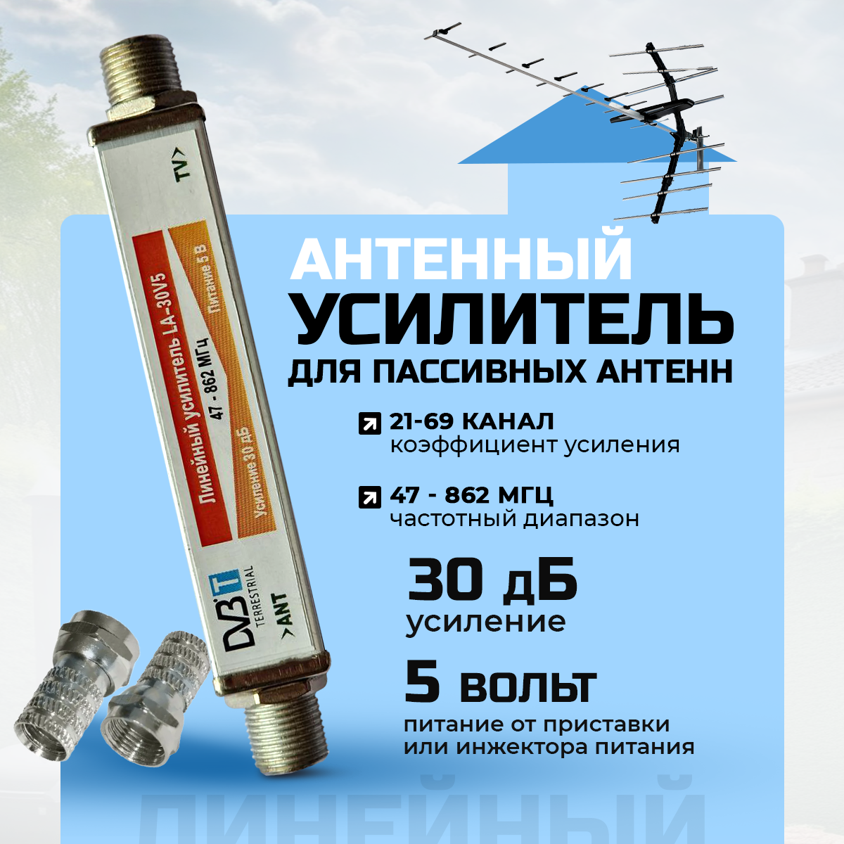 Купить Усилитель ТВ сигнала линейный Zolan LA-30V5 для цифровых пассивных ТВ антенн DVB-T2, питание по антенному кабелю 5 В от ТВ приставки или инжектора