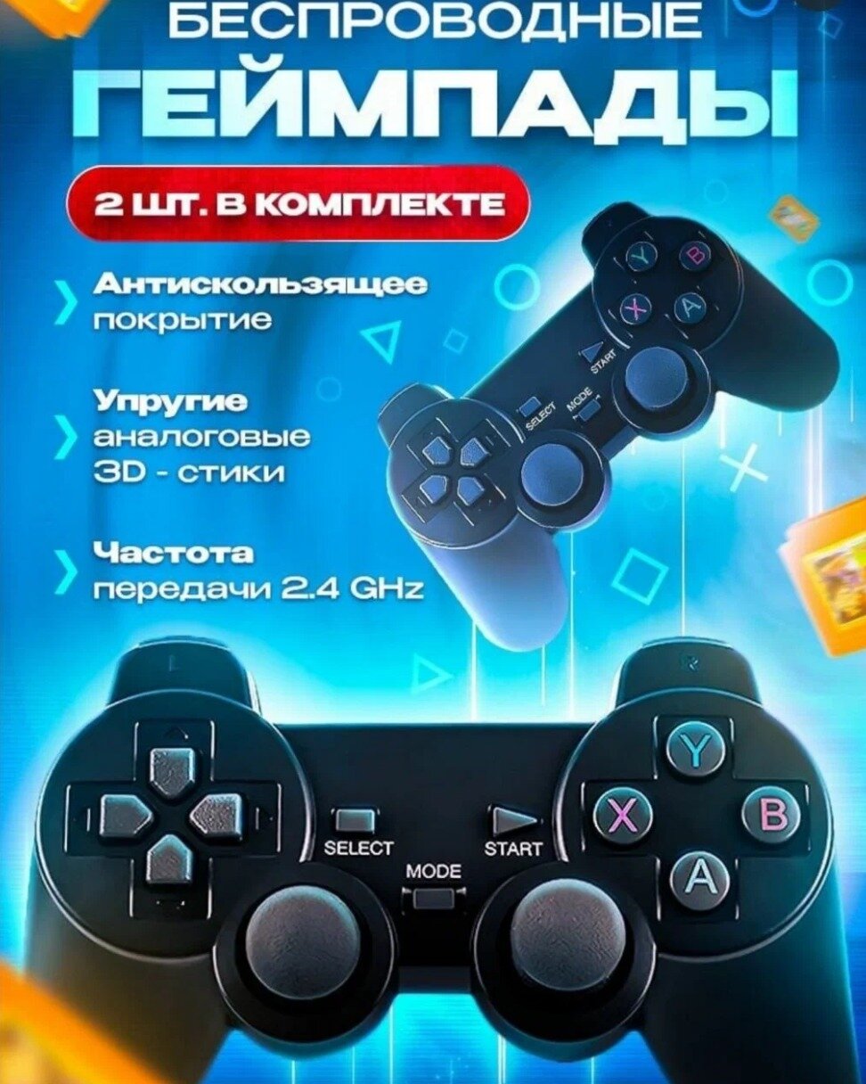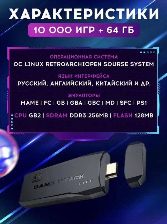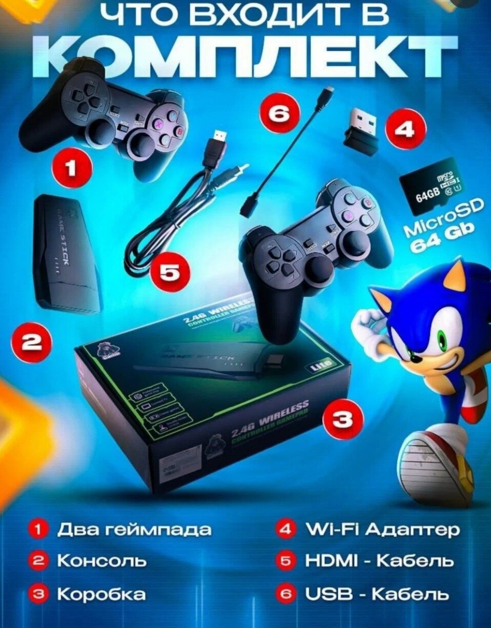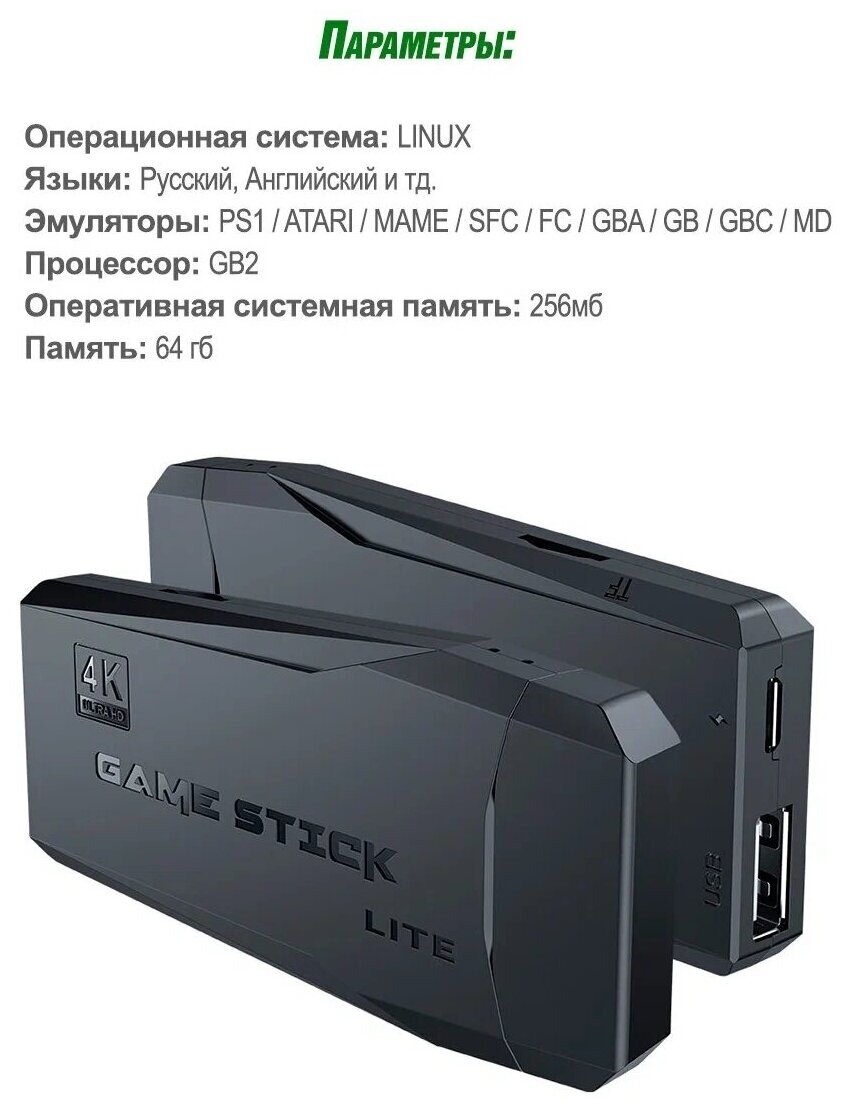 | Дополнительная информация | Карта памяти 2 геймпада; Игровая консоль - 1шт; Джойстики - 2шт; hdmi-переходник - 1шт; кабель питания - 1шт; microSD - 64GB; wi-fi передатчик; инструкция |