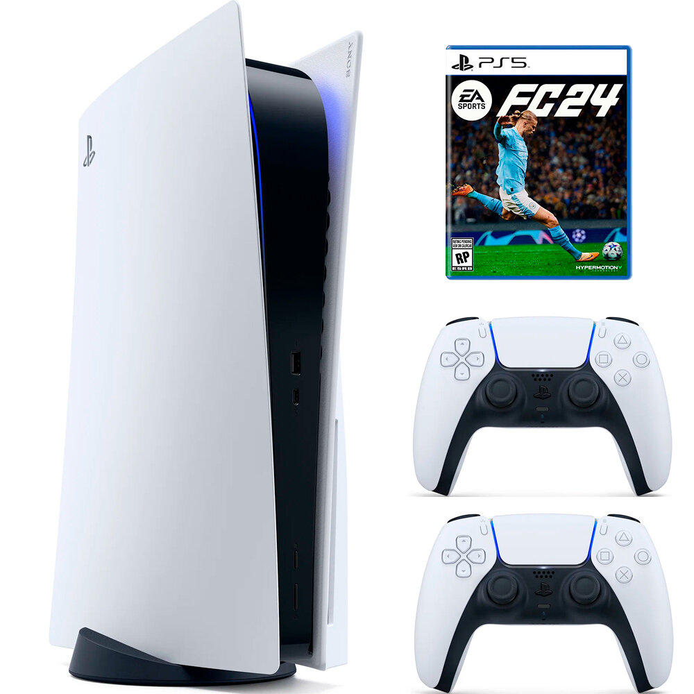 Игровая приставка Sony PlayStation 5 Slim, с дисководом, 1 ТБ, два геймпада (белый и черный), Fifa 24