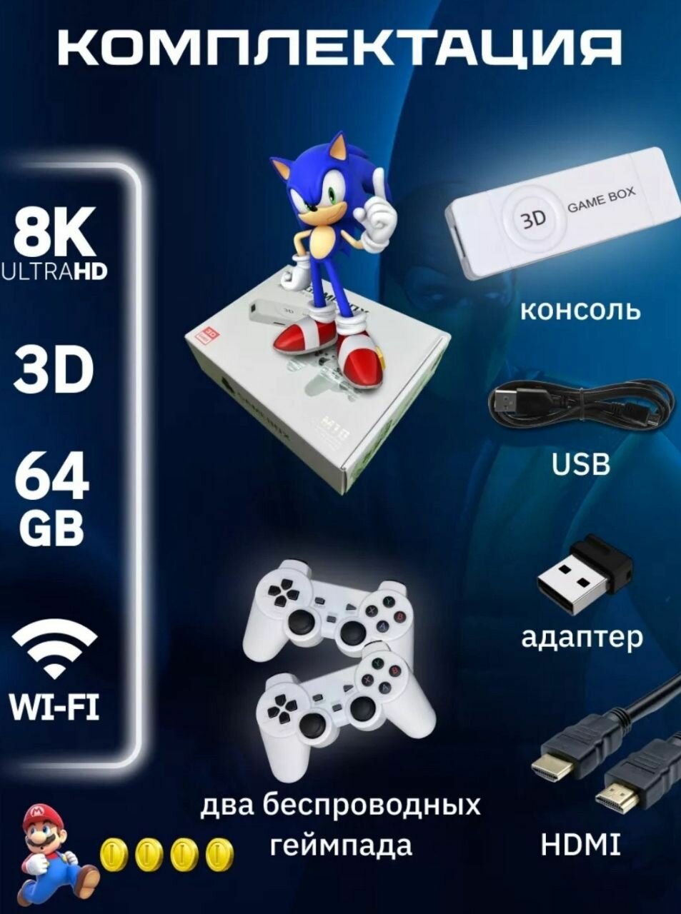 Игровая приставка 3D GAMEBOX, 10000 игр 4K, 64 GB, 2 беспроводных джойстика Портативная консоль для детей интересное: