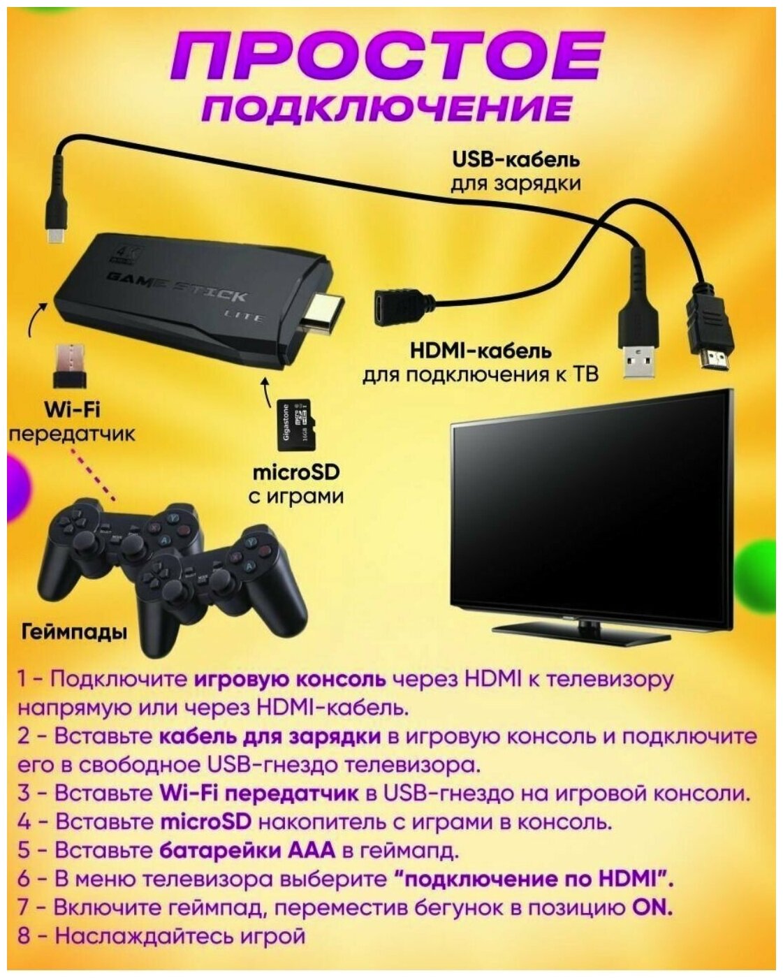 Игровая приставка, консоль Game Stick Lite 64Gb, 3555 игр, 4K, 2,4 ГГц, 8 бит, 16 бит, 32 бит