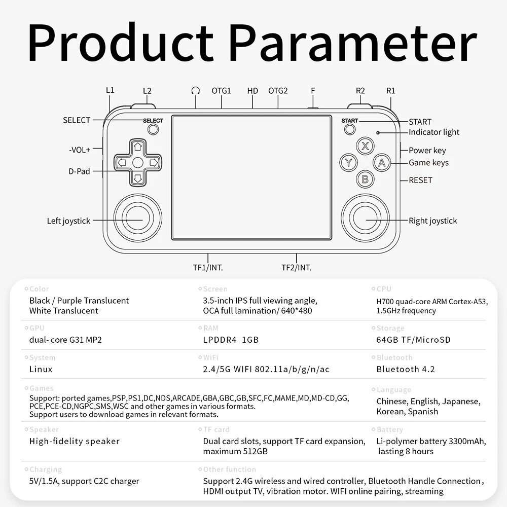 Консоль игровая приставка ANBERNIC RG35XX H (2024), 3,5 дюйма, 3300 мА*ч, IPS экран, 5000 игр, 64 Гб, прозрачный