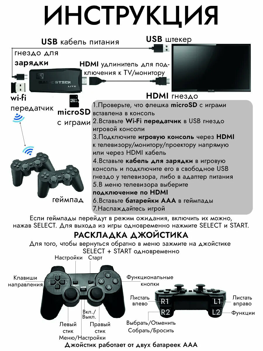 Игровая приставка, консоль Game Stick Lite 64Gb, 3555 игр, 4K, 2,4 ГГц, 8 бит, 16 бит, 32 бит