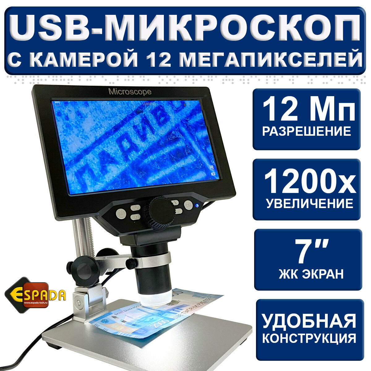 Купить Микроскоп E-G1200A USB Espada 12Мп с дисплеем и подставкой
