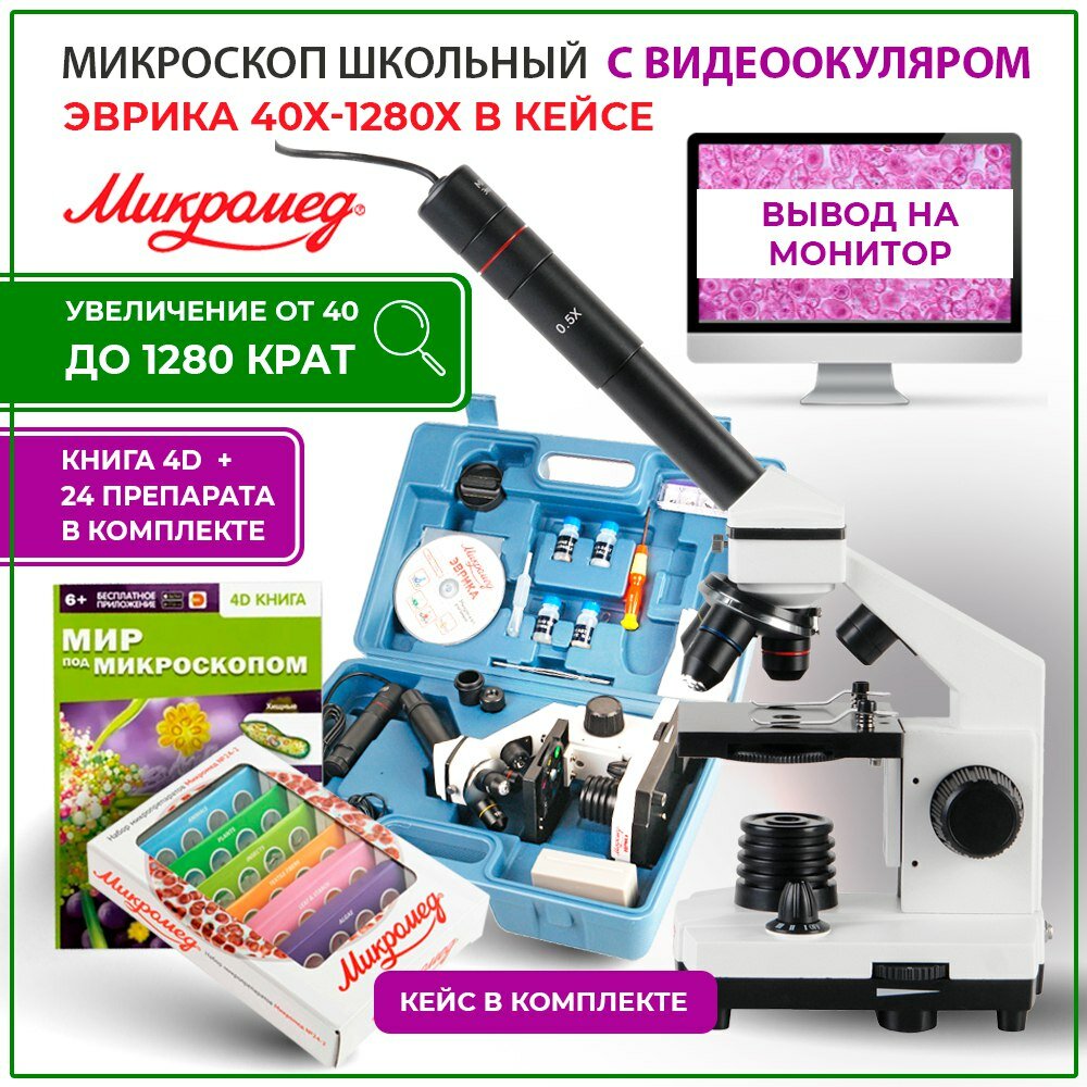 Микроскоп Микромед Эврика 40–1280х с видеоокуляром в кейсе с книгой 4D "Мир под микроскопом"