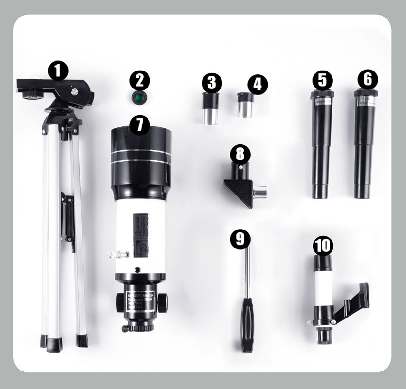 | Комплектация | Штатив + лунный фильтр + окуляр 1: H20mm + окуляр 2: H6mm + 1.5 X положительное зеркало + 3X лупа + корпус основного объектива + зеркало заднего вида + ручка фокусировки + оптический искатель звезд 5 × 24 |