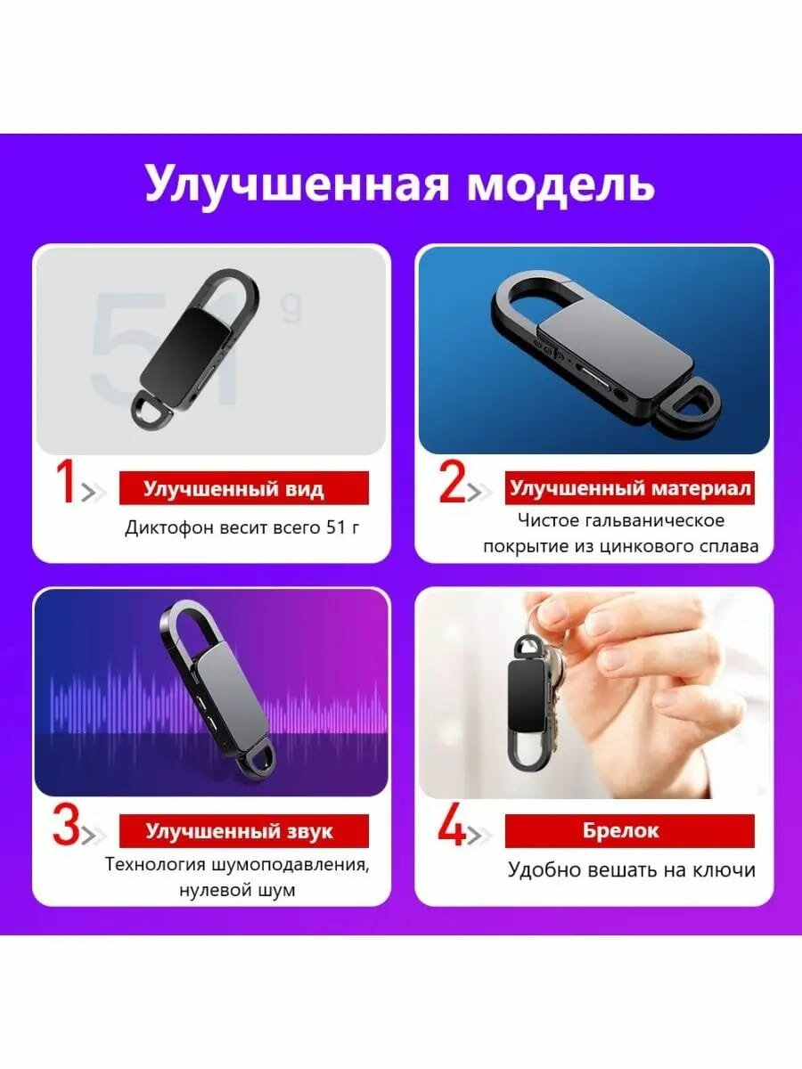 Диктофон брелок с карабином SV-29, встроенная память 8 GB, датчик звука, запись во время зарядки, автосохранение файлов, металлический корпус интересное:
