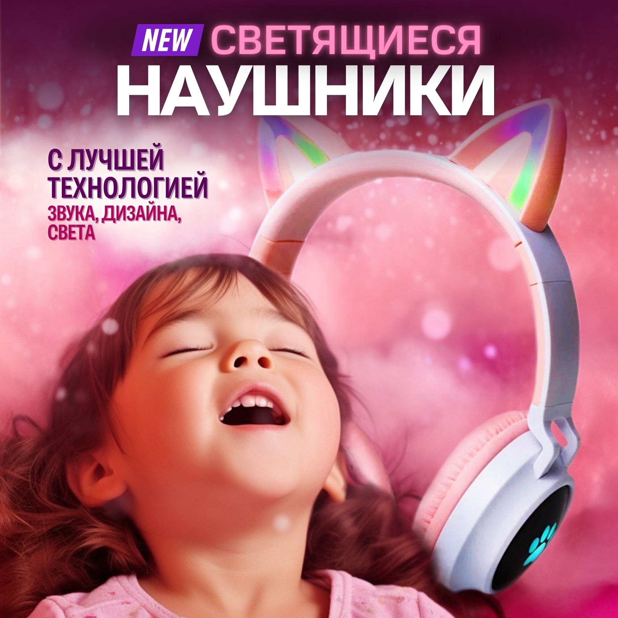 Беспроводные детские наушники для мальчиков и девочек светящиеся накладные с кошачьими ушками и микрофоном Bluetooth 5.2 розового цвета TELZEN интересное: