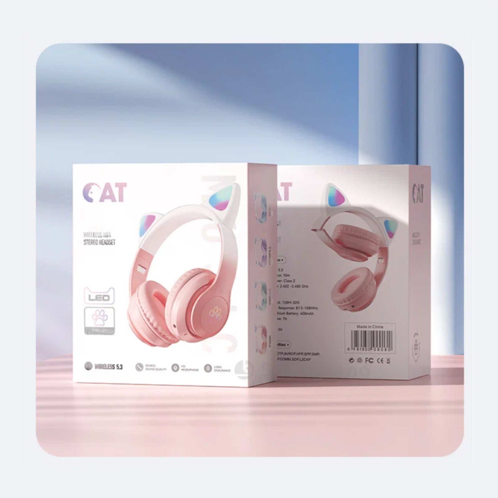 Наушники беспроводные светящиеся с ушками кошки для детей девочек мальчиков Kitty Pretty Pro, ушки блютус, розовые