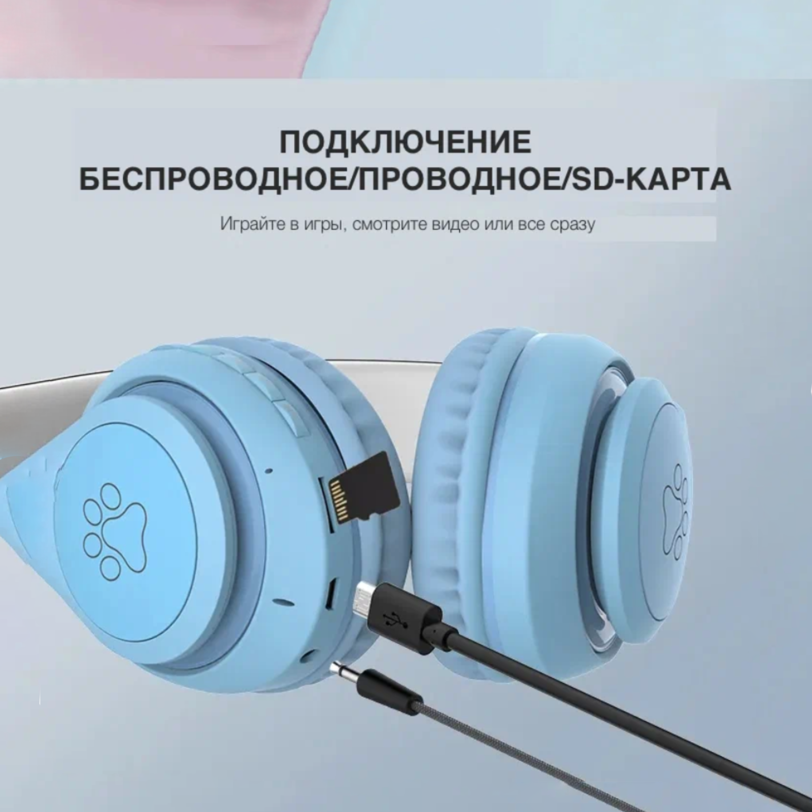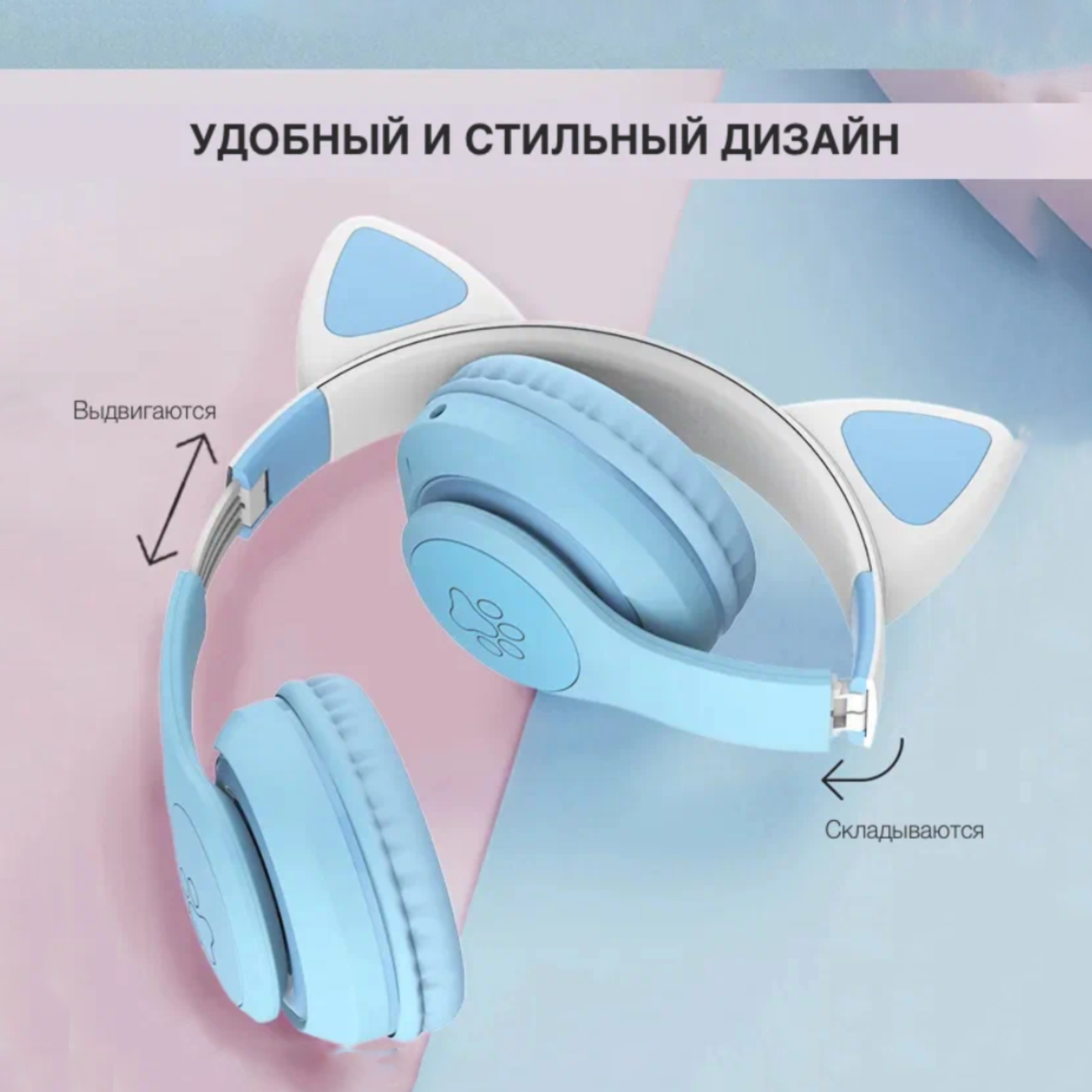 Купить Наушники беспроводные светящиеся с ушками кошки для детей девочек мальчиков Kitty Pretty Pro, ушки блютус, синие