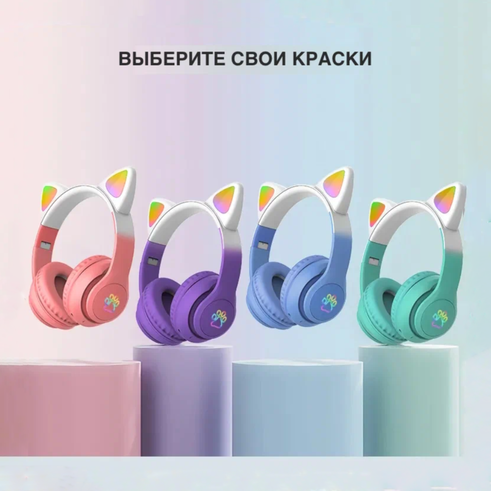 Наушники беспроводные светящиеся с ушками кошки для детей девочек мальчиков Kitty Pretty Pro, ушки блютус, фиолетовые