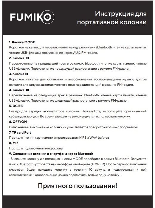Ниже Вы можете прочитать отзывы на Портативная колонка FUMIKO TOWER с микрофоном черная, ознакомится с подробными характеристиками, посмотреть интересные обзоры и фотографии на Портативная колонка FUMIKO TOWER с микрофоном черная.