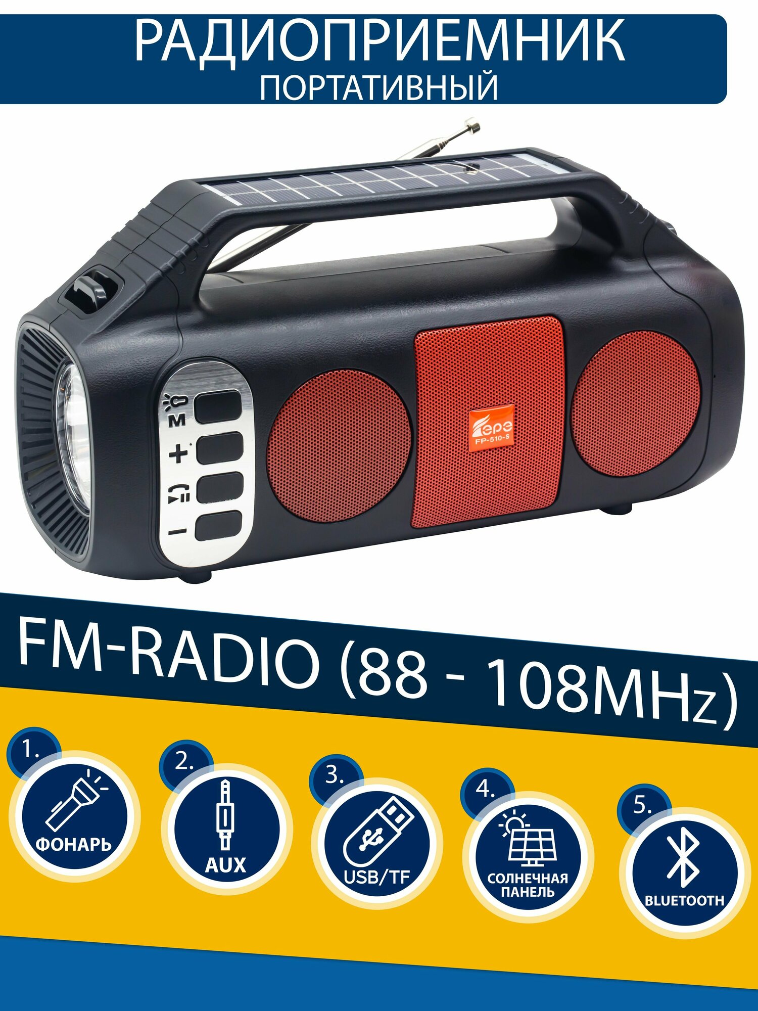 Купить Радиоприемник EPE с Bluetooth с двумя солнечными панелями, фонарем и слотом для флешки и TF