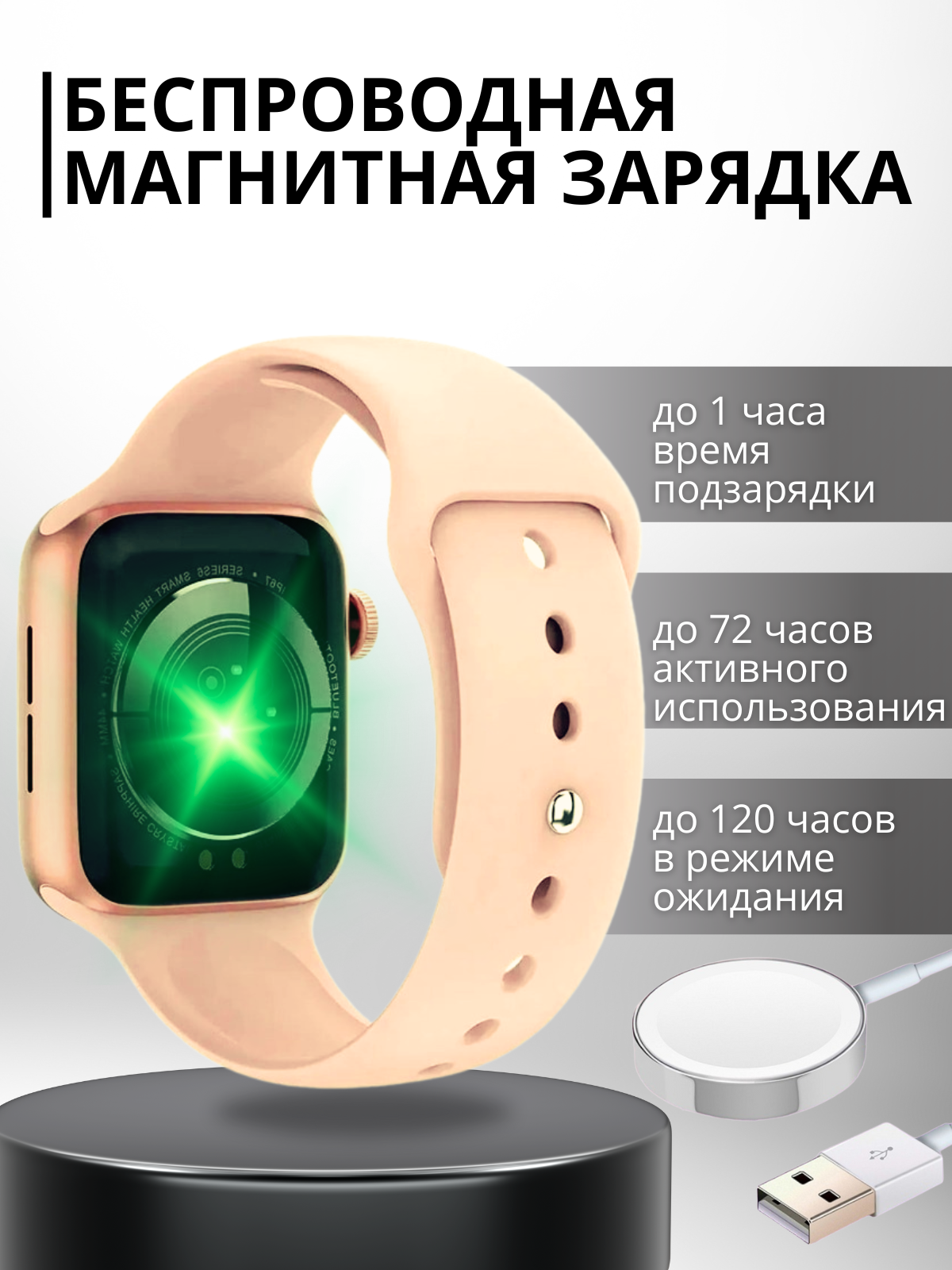 | Особенности | беспроводная зарядка / воспроизведение аудио / магнитная зарядка / поиск смартфона / установка сторонних приложений |