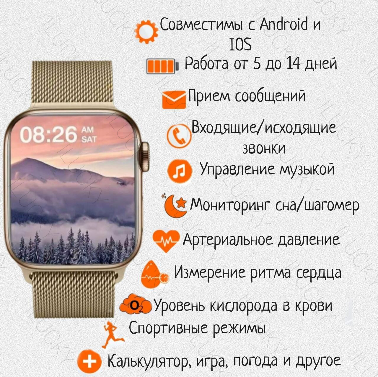 | Мониторинг | пульса, сна, температуры тела, термометр, тонометр, уровня кислорода в крови, физической активности |