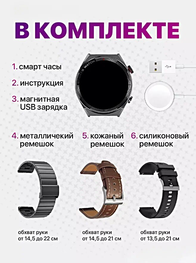 | Дополнительная информация | Комплектация умные часы DT3Max 46 мм - 1 шт., силиконовый ремешок - 1 шт., ремешок из искусственной кожи - 1 шт., металлический ремешок - 1 шт., беспроводное зарядное магнитное устройство - 1 |