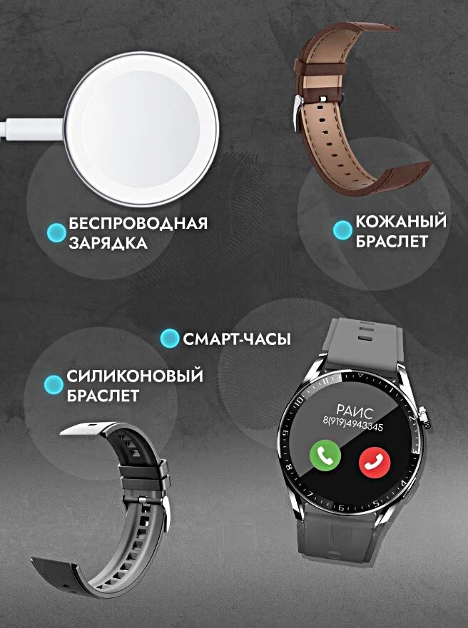 | Дополнительная информация | Комплектация: часы, силиконовый ремешок и ремешок из кожи, зарядное устройство, упаковка. |