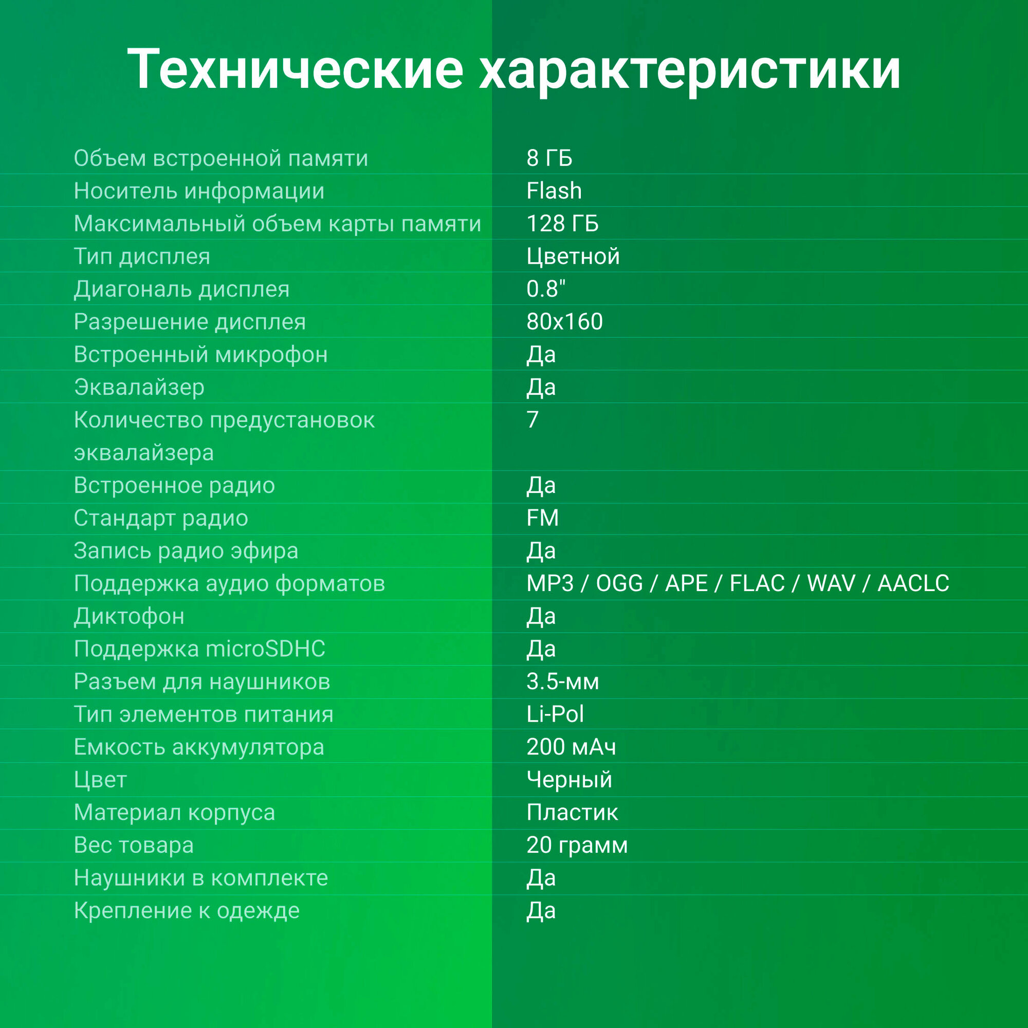 | Опции и комплект | FM-тюнер / диктофон / клипса / экран |