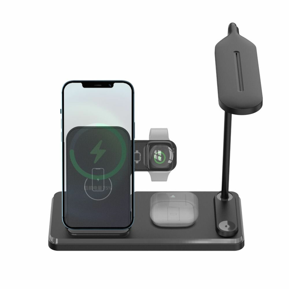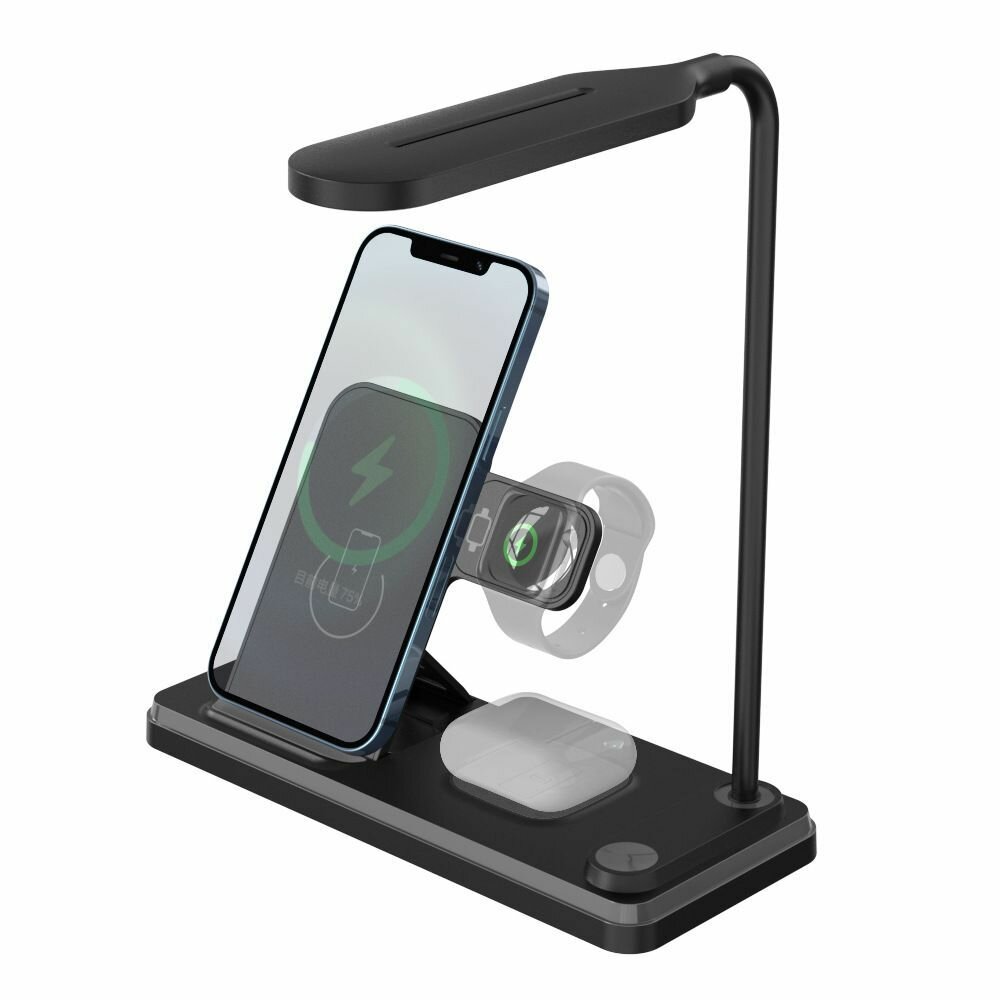 Купить Док-станция с быстрой зарядкой и настольной лампой Rohs 5.0-15W(QC), 4 в 1 для телефонов и часов. Цвет черный