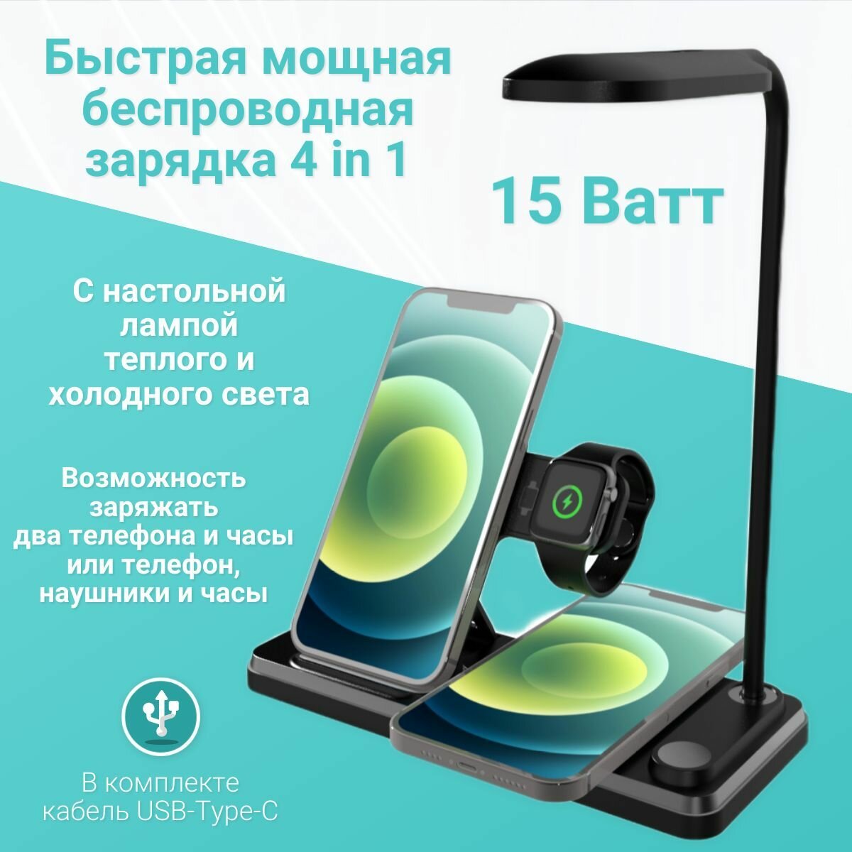 Док-станция с быстрой зарядкой и настольной лампой Rohs 5.0-15W(QC), 4 в 1 для телефонов и часов. Цвет черный интересное: