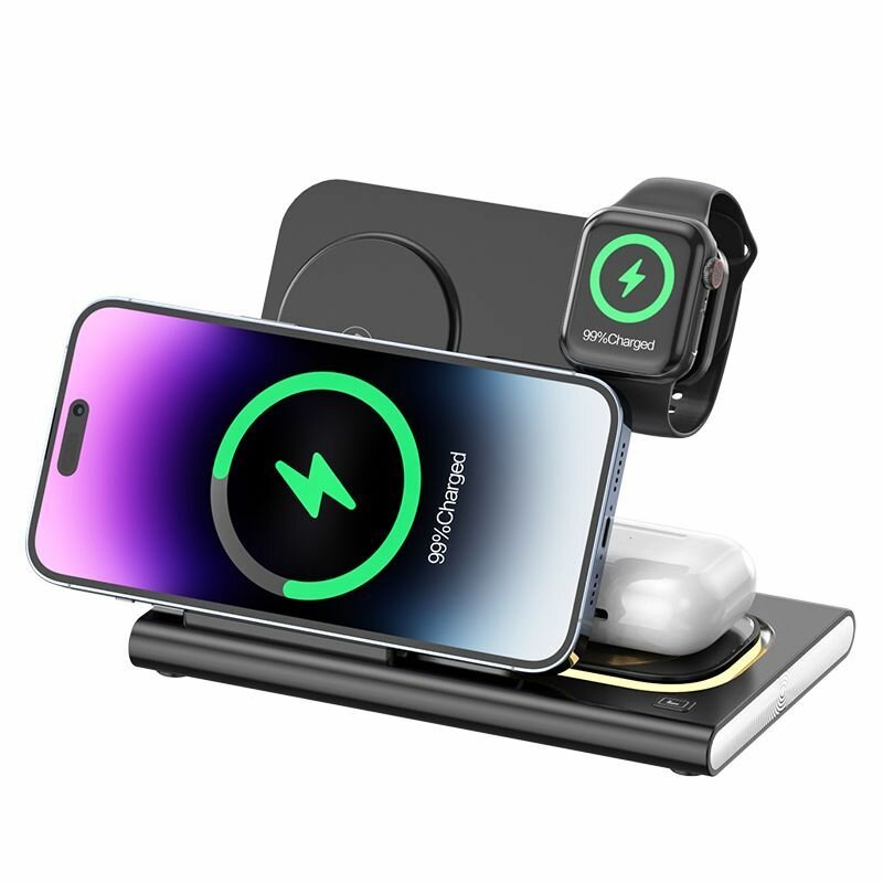 Купить Беспроводное зарядное устройство док - станция 4 в 1 для смартфонов Apple Iphone и Android, Samsung, Xiaomi, наушников Air Pods и часов Apple Watch. Цвет черный