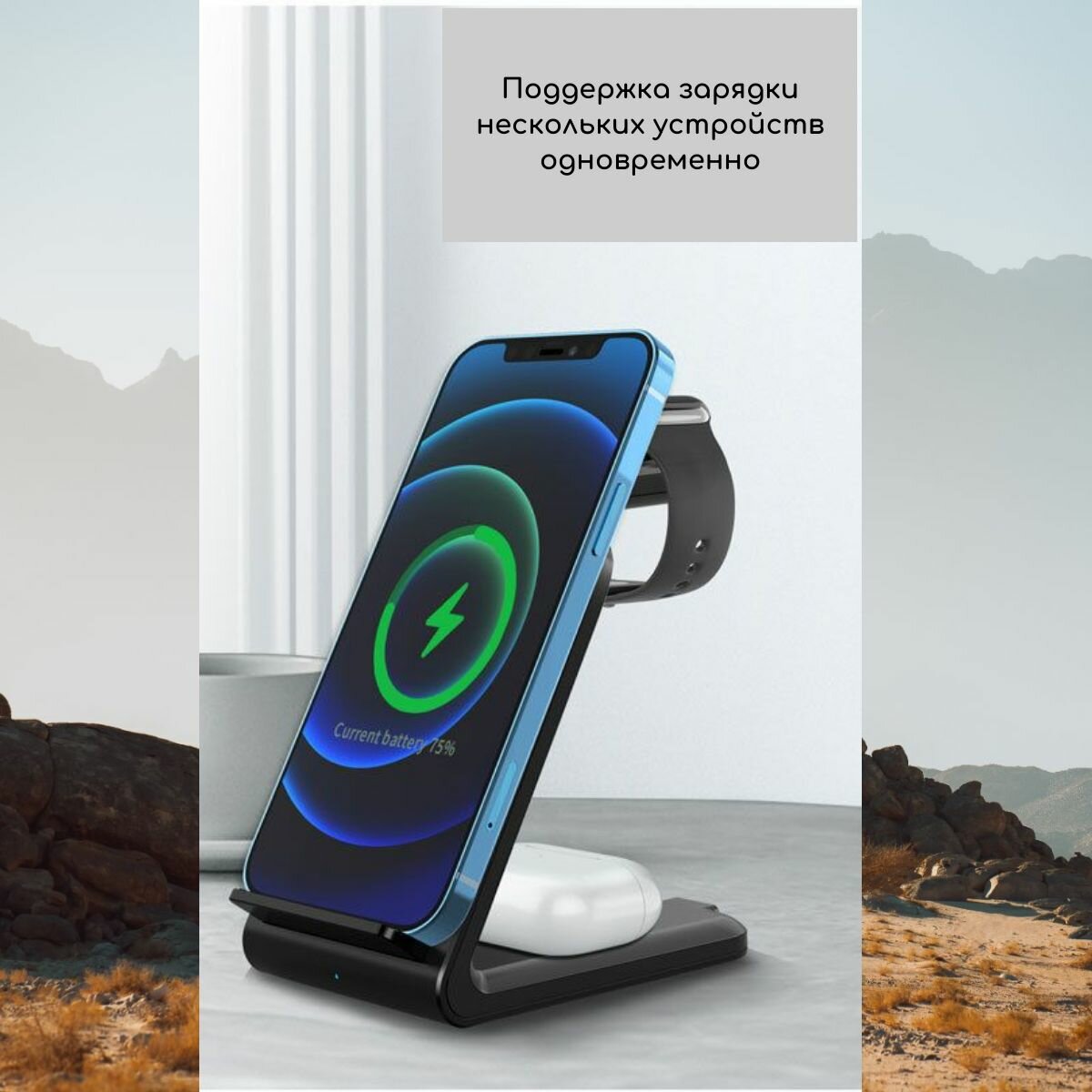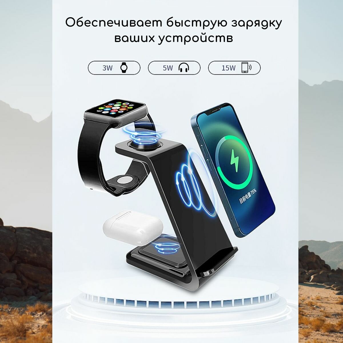 Док-станция с быстрой зарядкой Rohs 3.6-15W(QC), 3 в 1 для телефонов, наушников и часов. Цвет белый интересное: