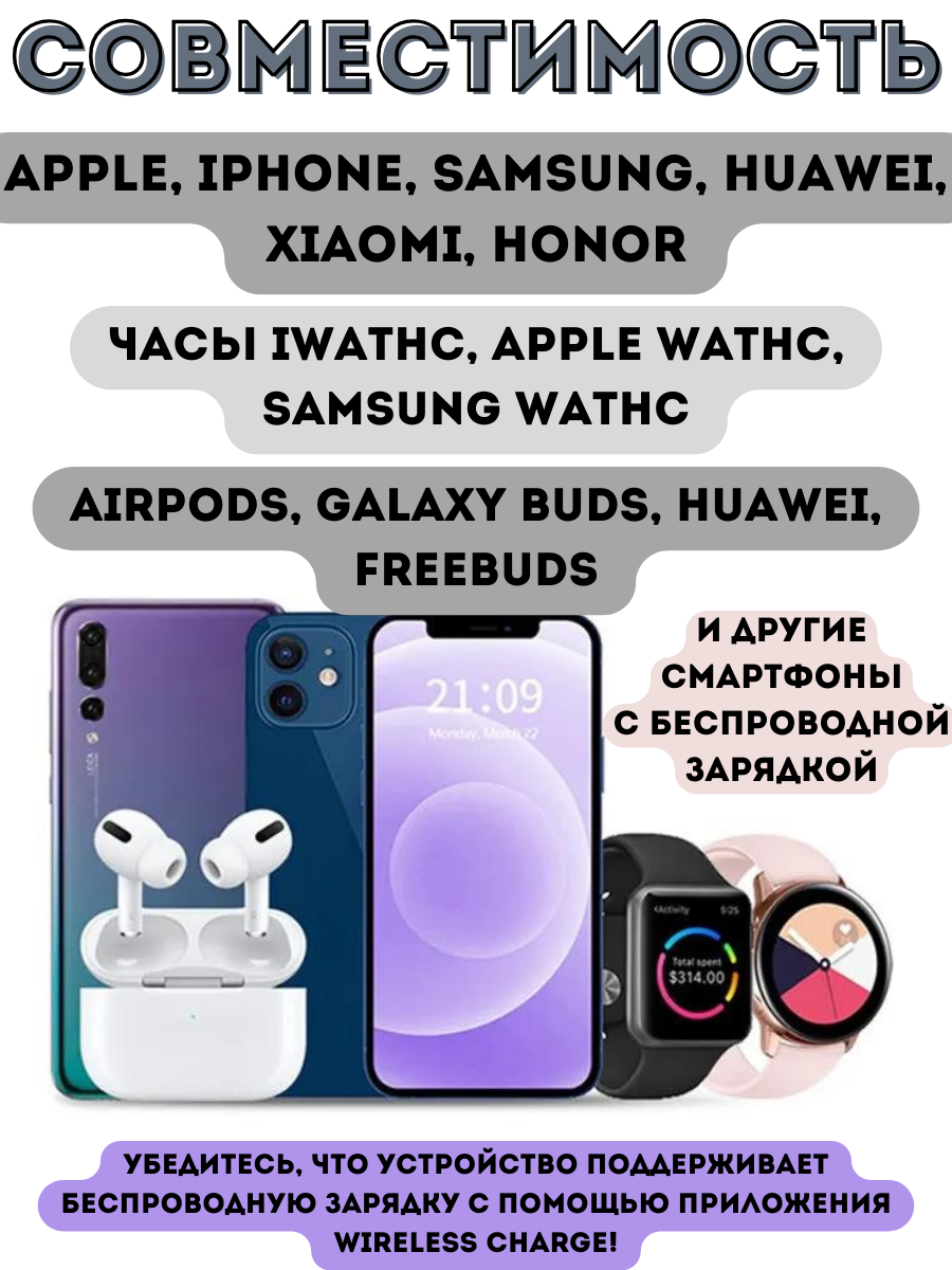 | Дополнительная информация | Данное устройство представляет собой быстрое беспроводное зарядное устройство 3 в 1, которое может поддерживать зарядку мобильного телефона/ часов/гарнитуры TWS Bluetooth, совместимых с Qi, а также имеется светодиодная подсветка ночник. |