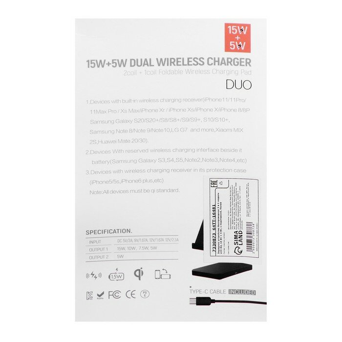 Беспроводная зарядная станция 2в1 LCC-82, 15 Вт и 5 Вт, с подставкой, белая (7330873) интересное: